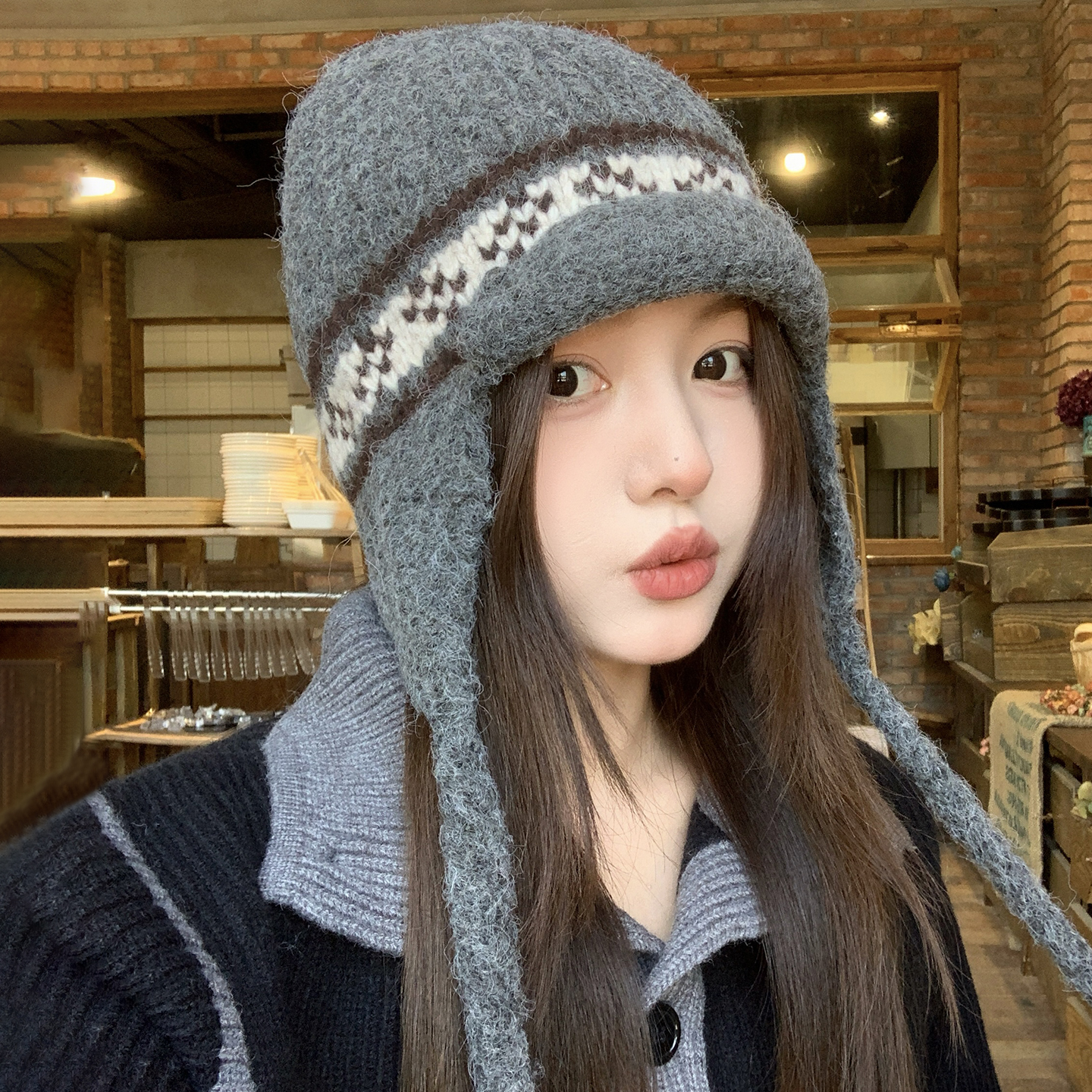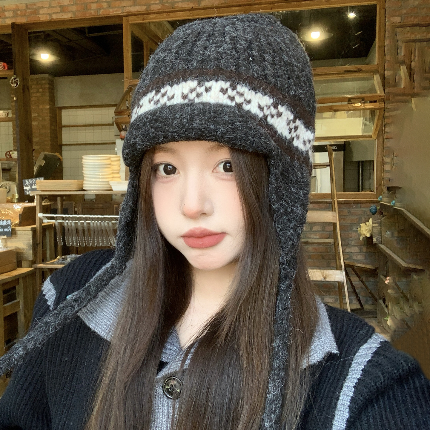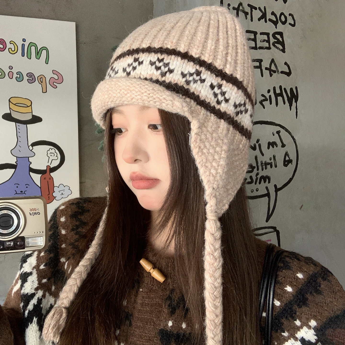 韩版撞色羊毛混纺雷锋帽子女秋冬加厚保暖针织帽护耳防寒毛线帽女