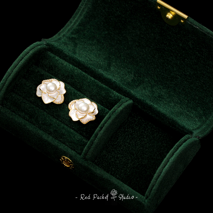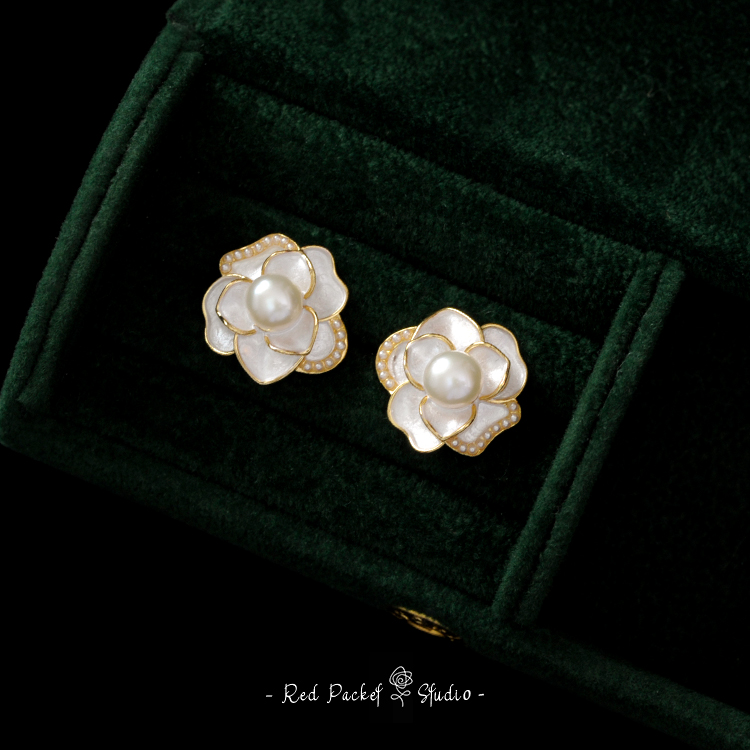 红口袋 法式复古小香风山茶花S925银针耳环天然淡水珍珠耳钉耳饰