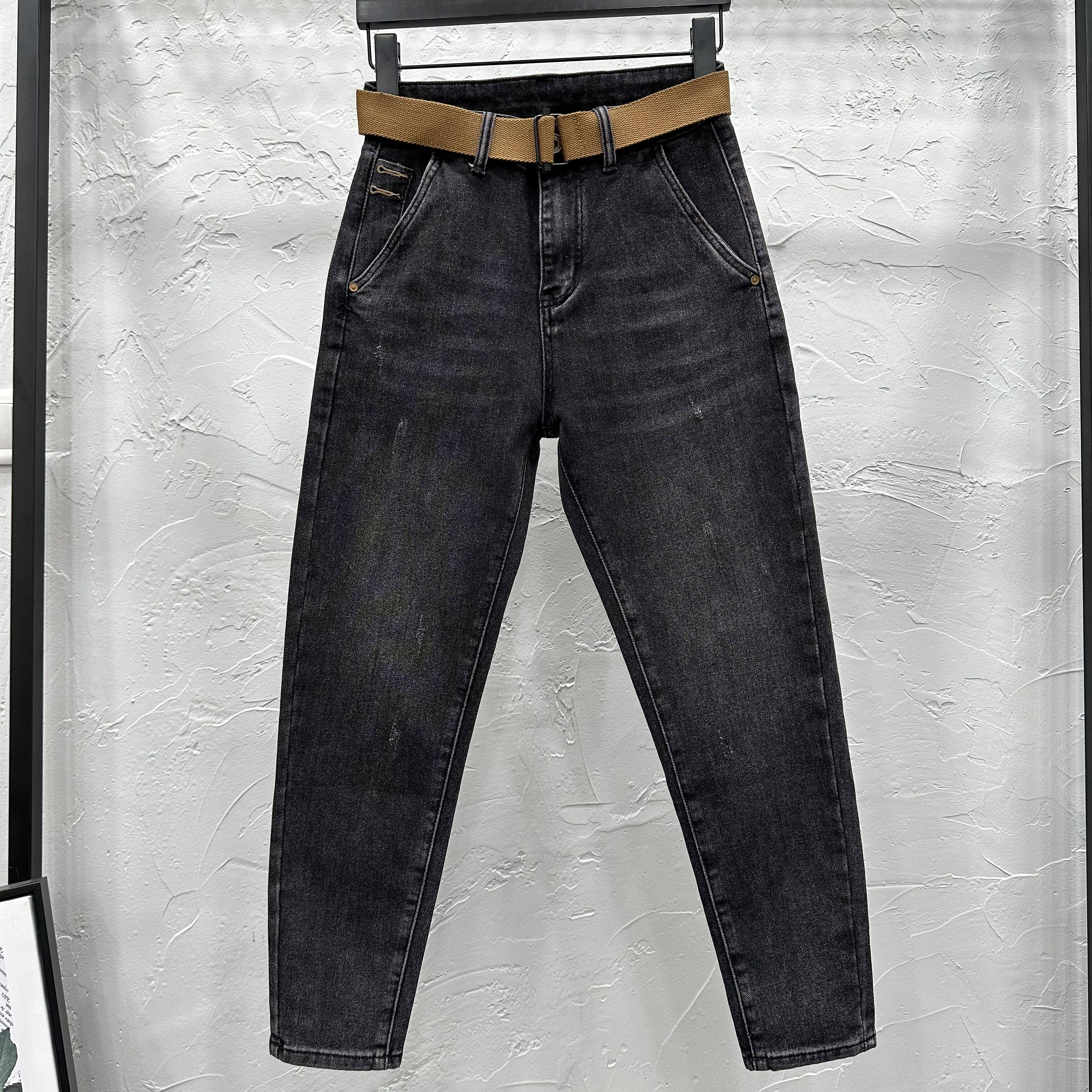 斜插口袋水洗黑灰修身小脚牛仔裤