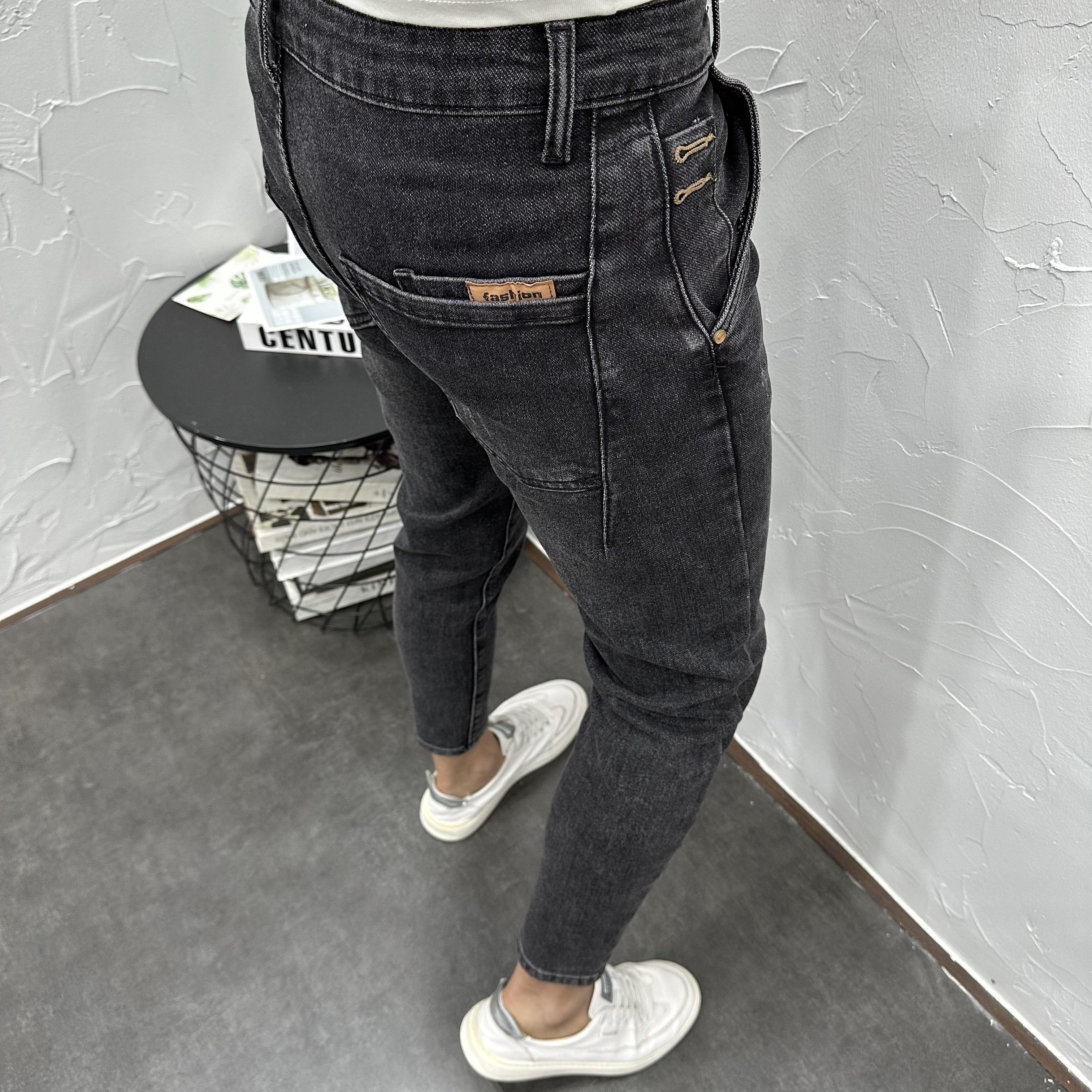斜插口袋水洗黑灰微跨修身小脚九分牛仔裤男夏秋潮流休闲弹力长裤