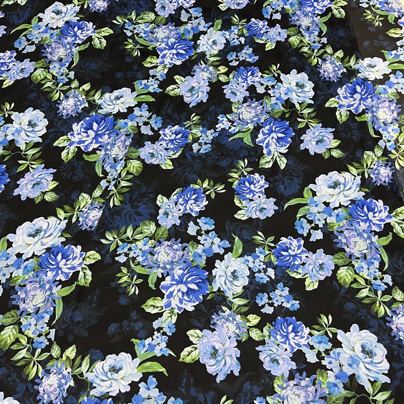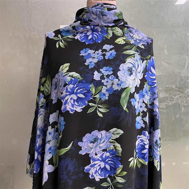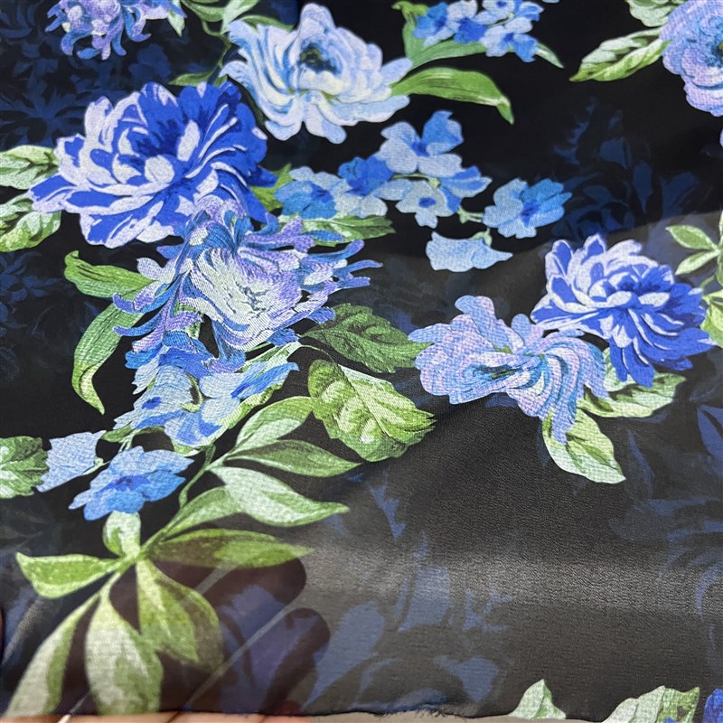 雪纺印花布料 黑底紫色花朵文艺复古微透衬衫连衣裙雪纺面料