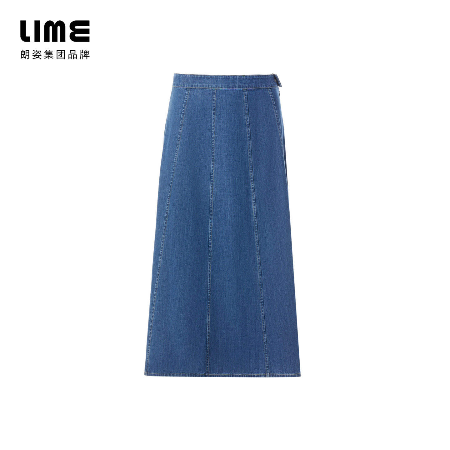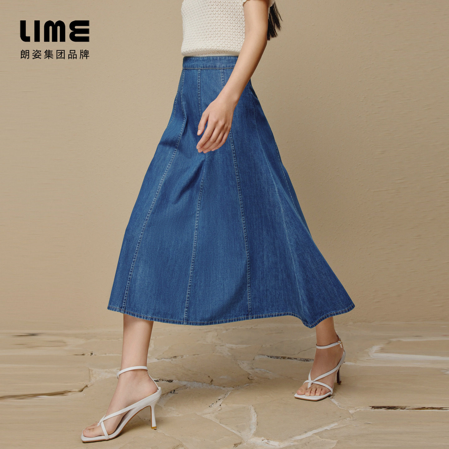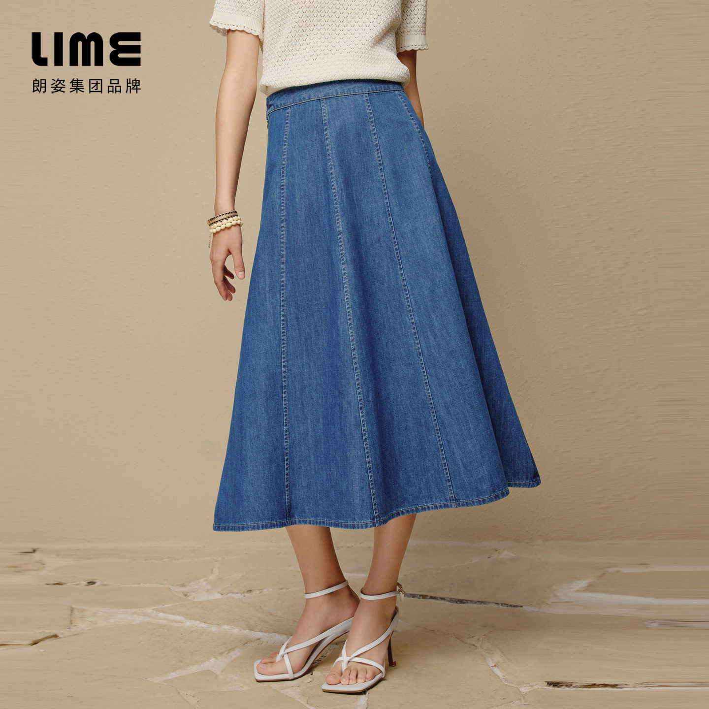 朗姿集团LIME莱茵复古高腰牛仔半裙藏蓝色25夏小个子大伞摆A字裙