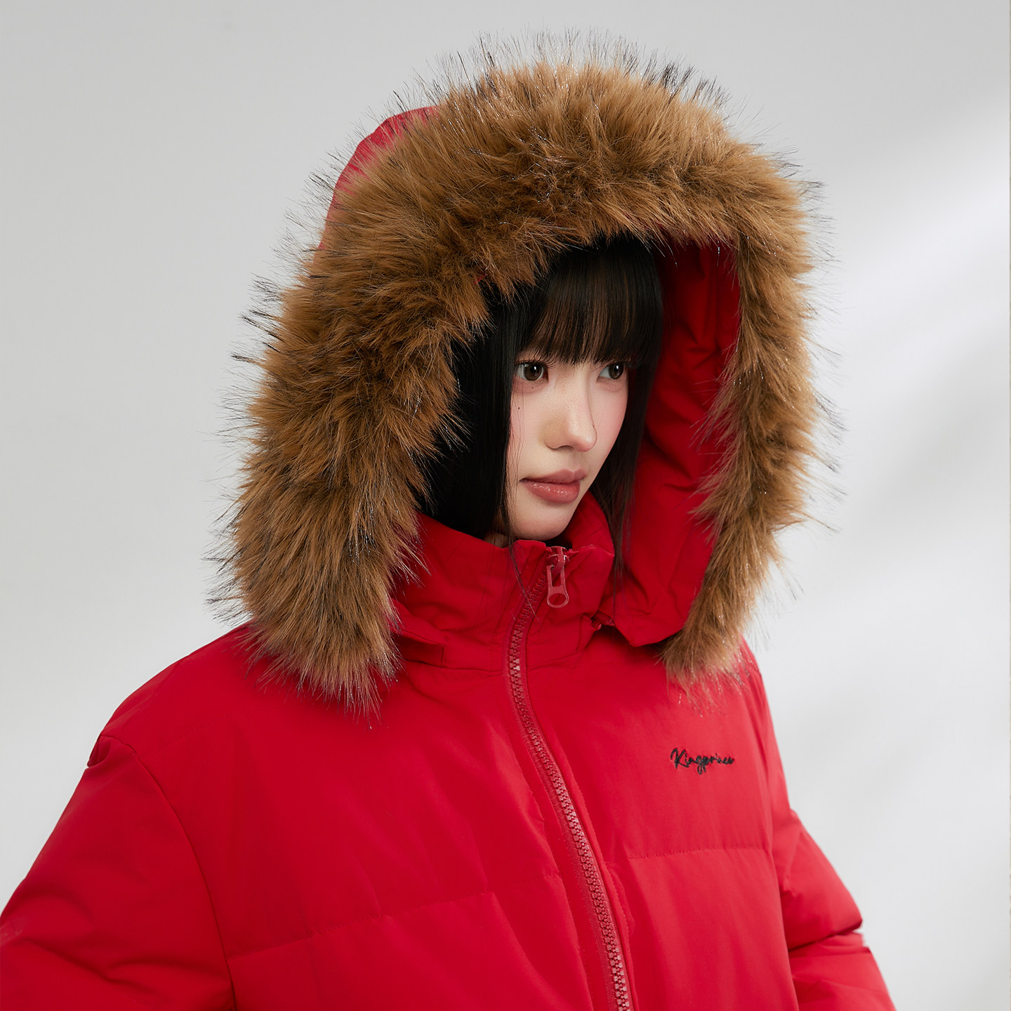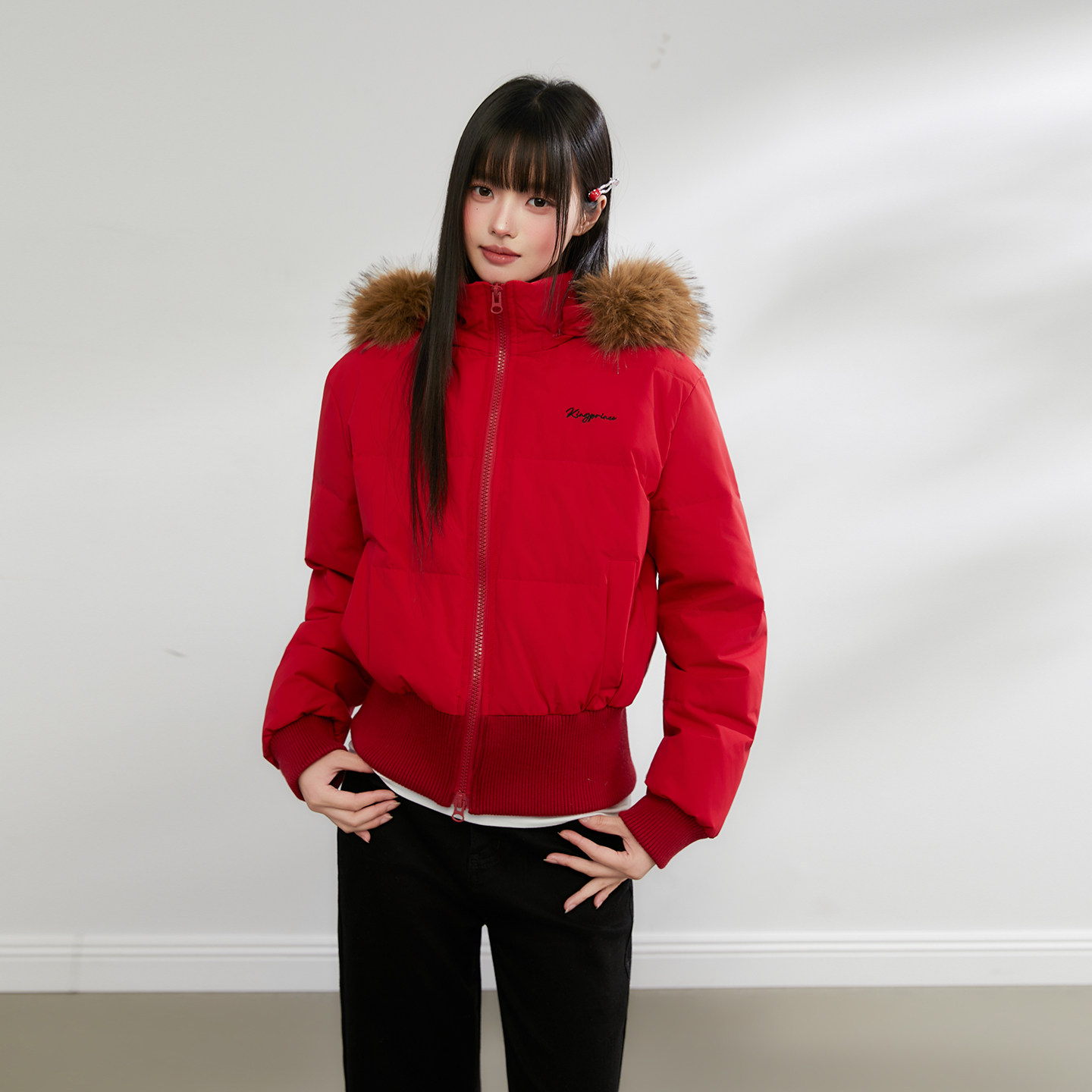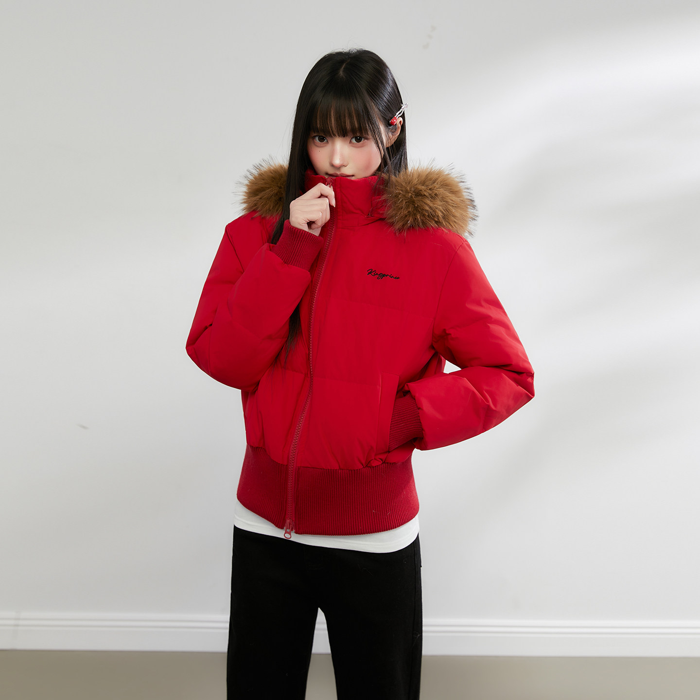 King Prince短款修身大毛领红色羽绒服女冬季显瘦高腰白鸭绒外套