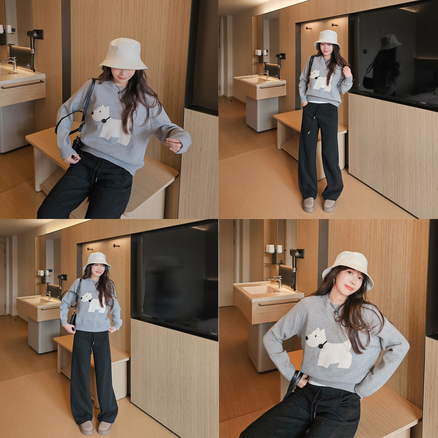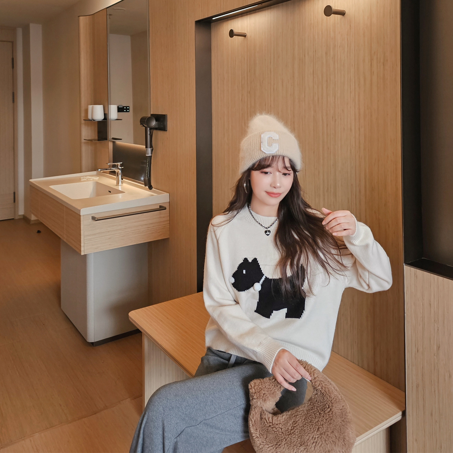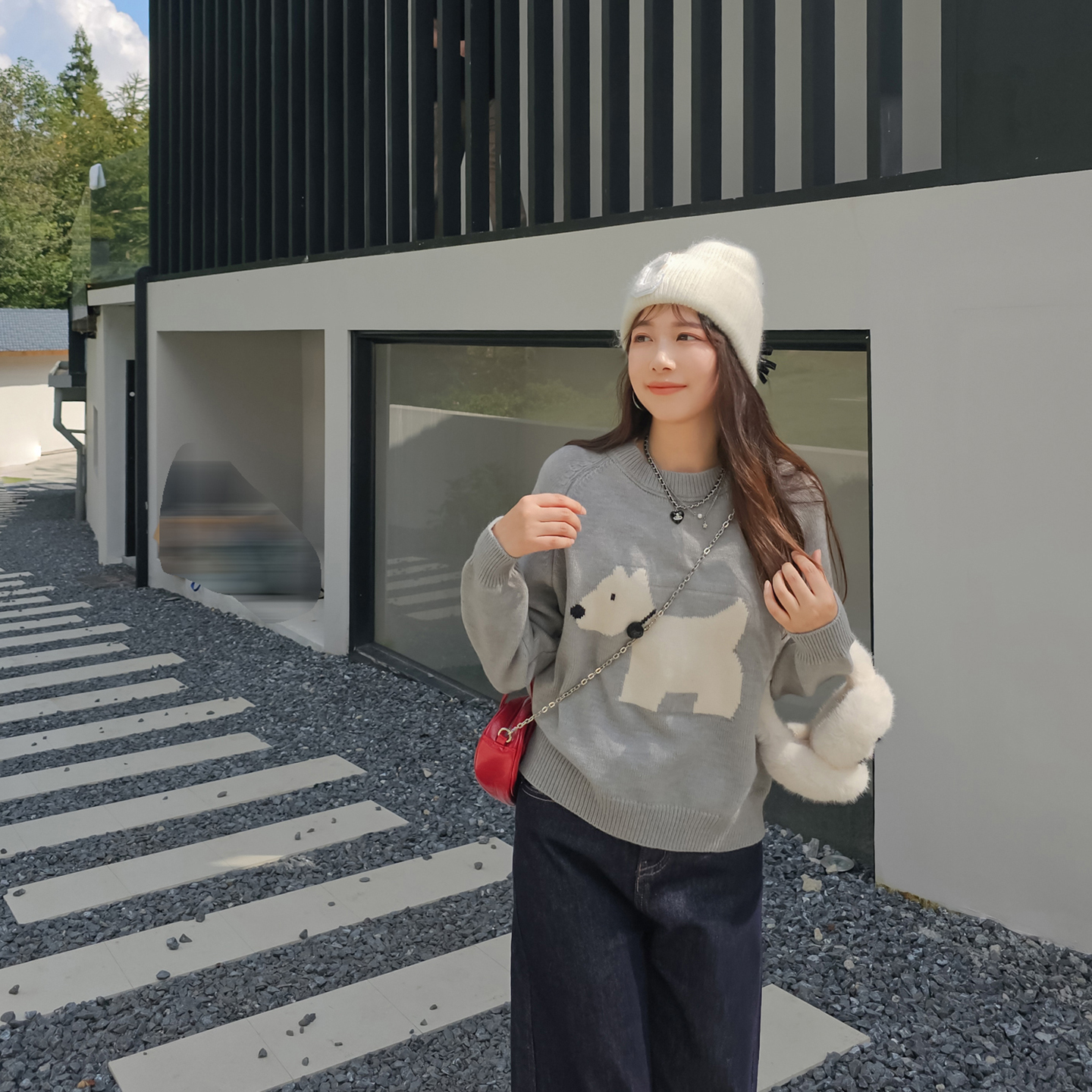 韩系圆领狗狗提花套头毛衣女2025秋冬新款宽松短款软糯针织衫上衣