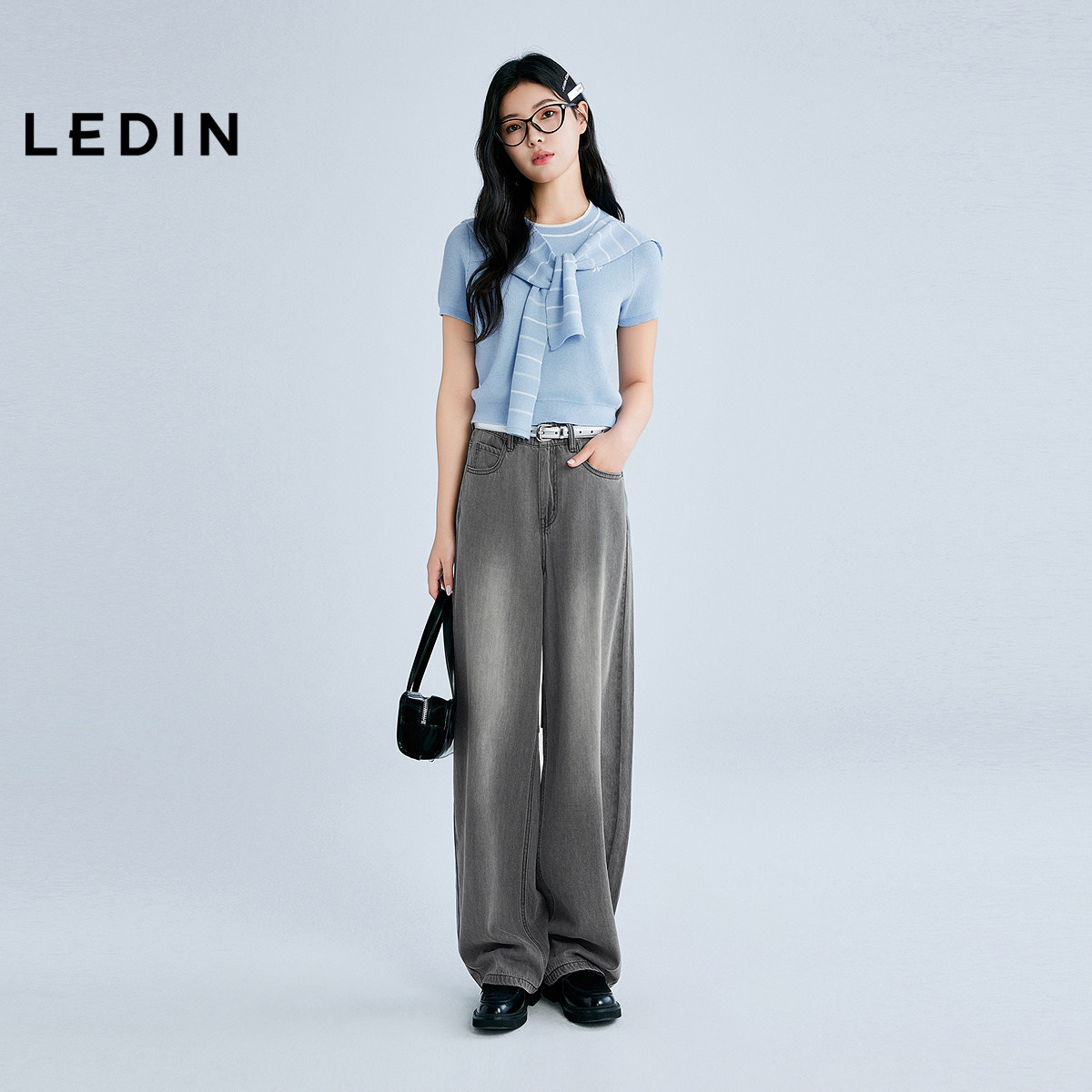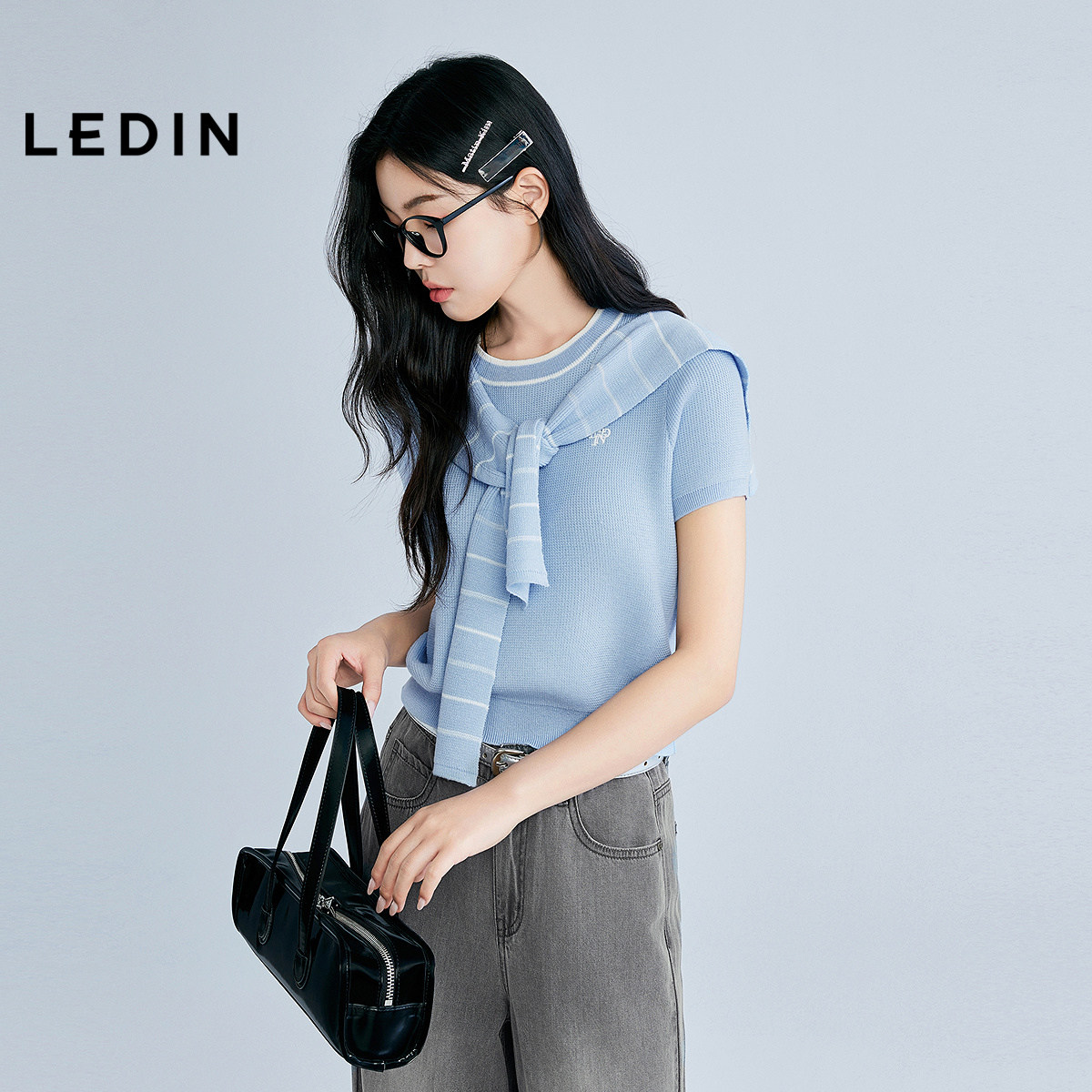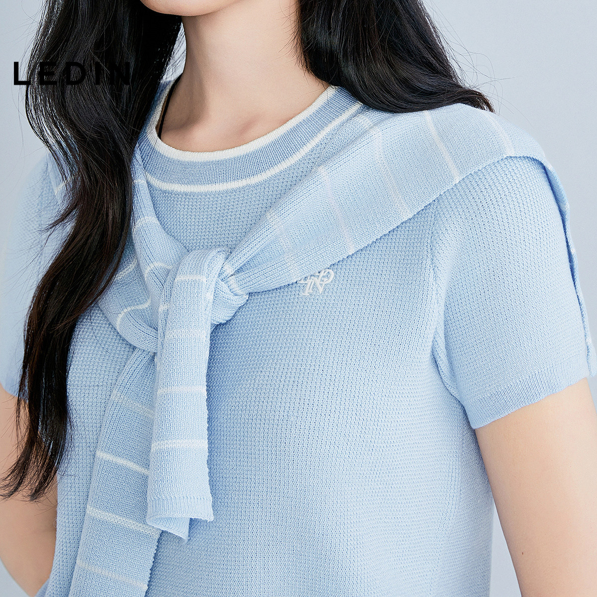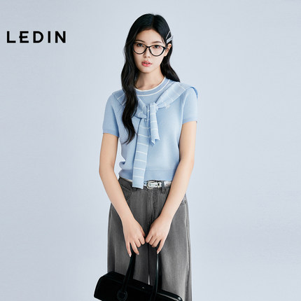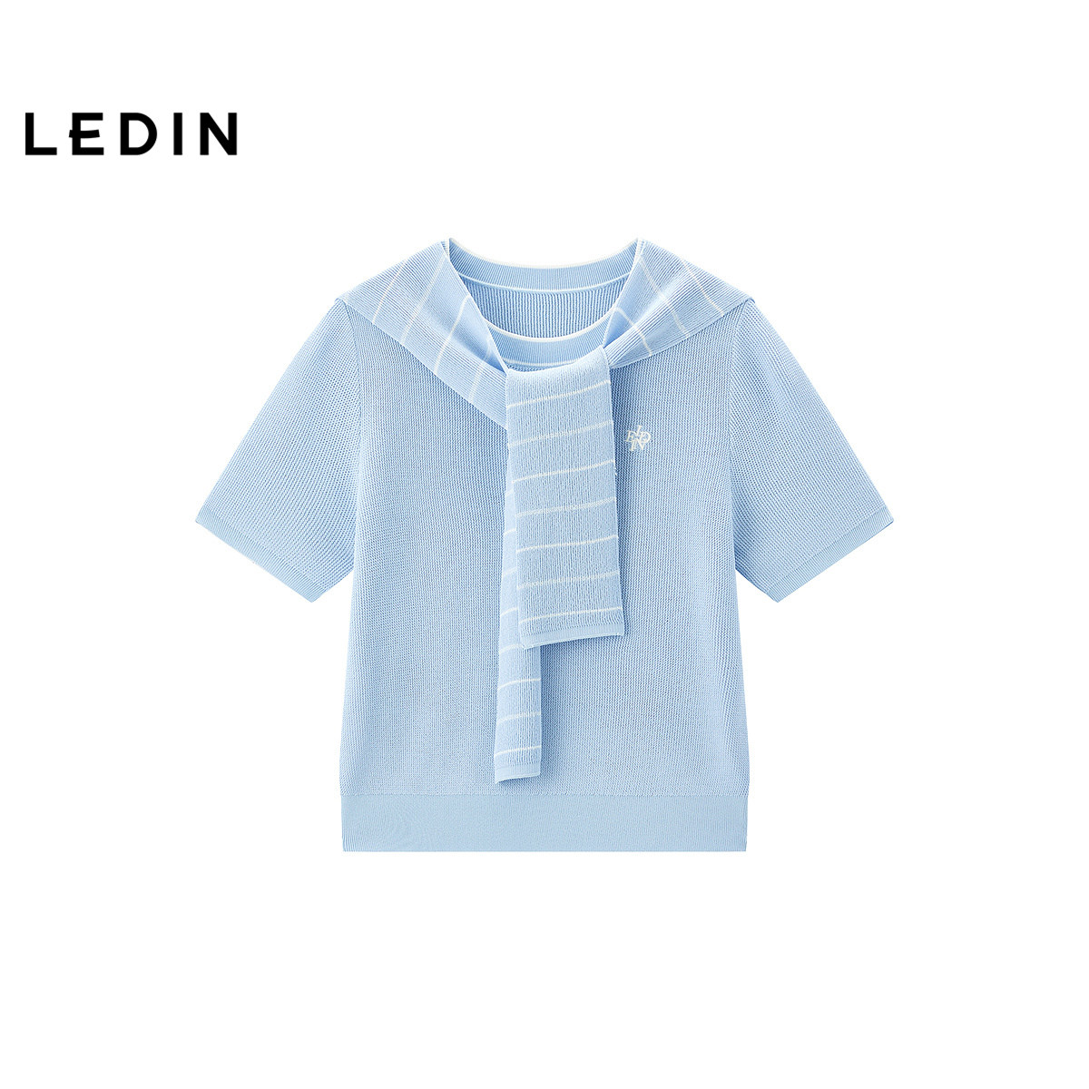 【商场同款】乐町圆领披肩针织短袖夏季新款蓝色上衣T恤C2EEF2313