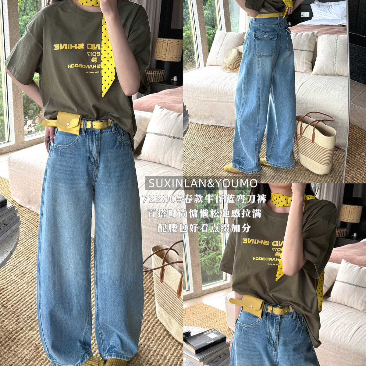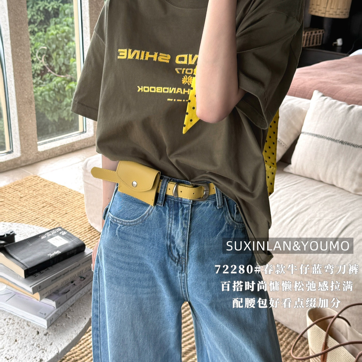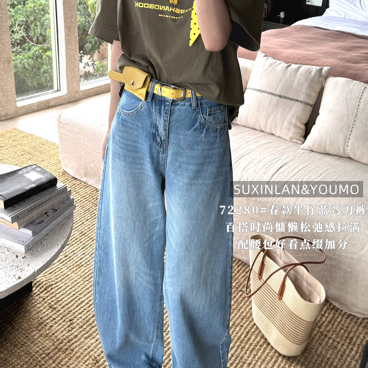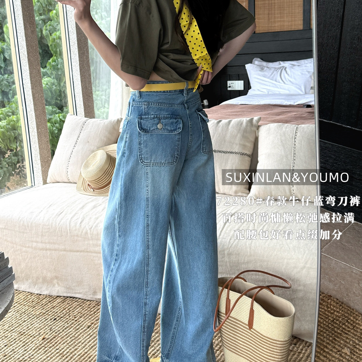 素心兰/YOUMO-瘦休闲后口袋特色牛仔裤(配腰带,腰包)(百搭弯刀裤)