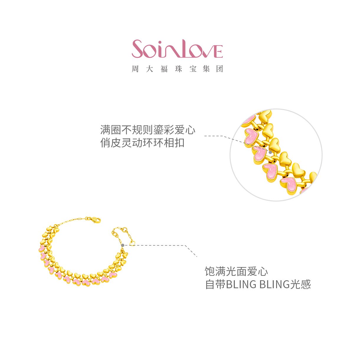 周大福SOINLOVE宝藏女孩爱心满心偏心黄金手链女生日礼物