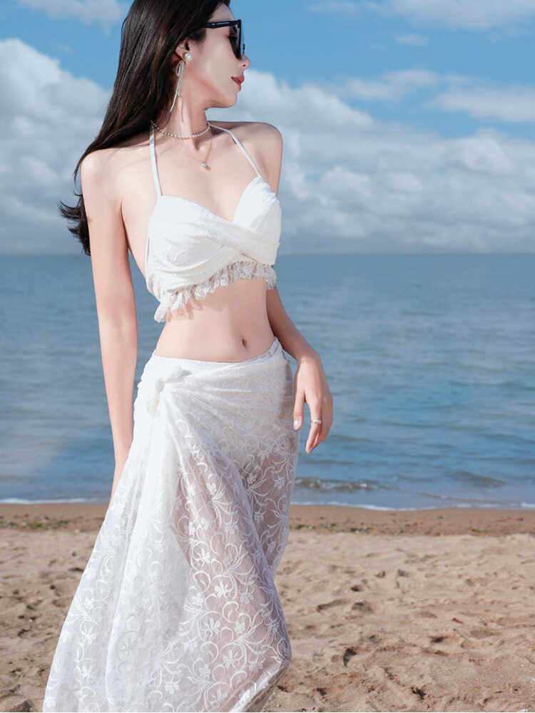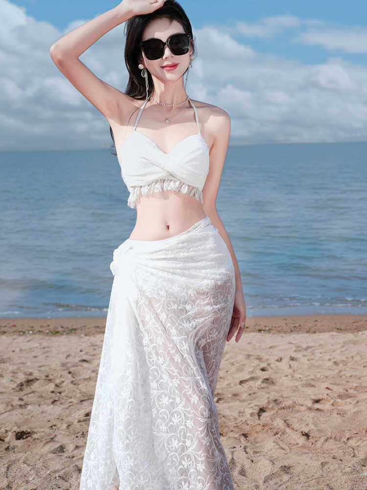 女遮肚蕾丝分体游泳衣性感三件套仙气泳衣比基尼显瘦长袖温泉泳装