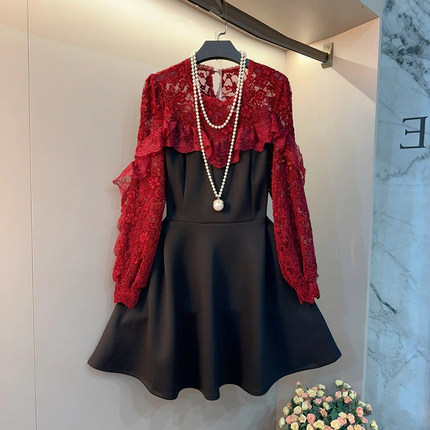 圆领拼接荷叶边蕾丝拼色连衣裙