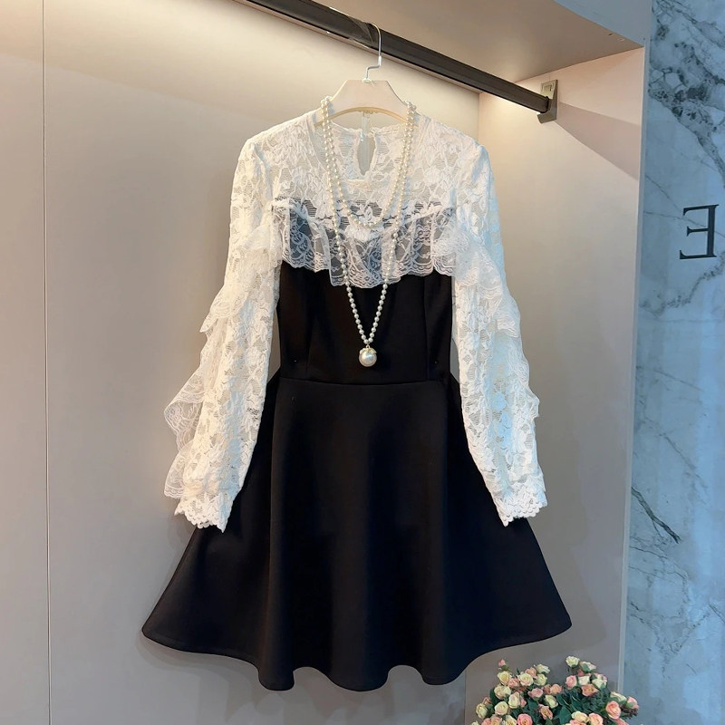 加肥拼接荷叶边蕾丝长袖拼色裙摆连衣裙大码女装韩版名媛风淑女裙