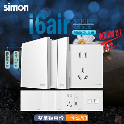 西蒙i6air系列铂晶冰璃白色一开五孔usb 二开单双控开关电脑插座