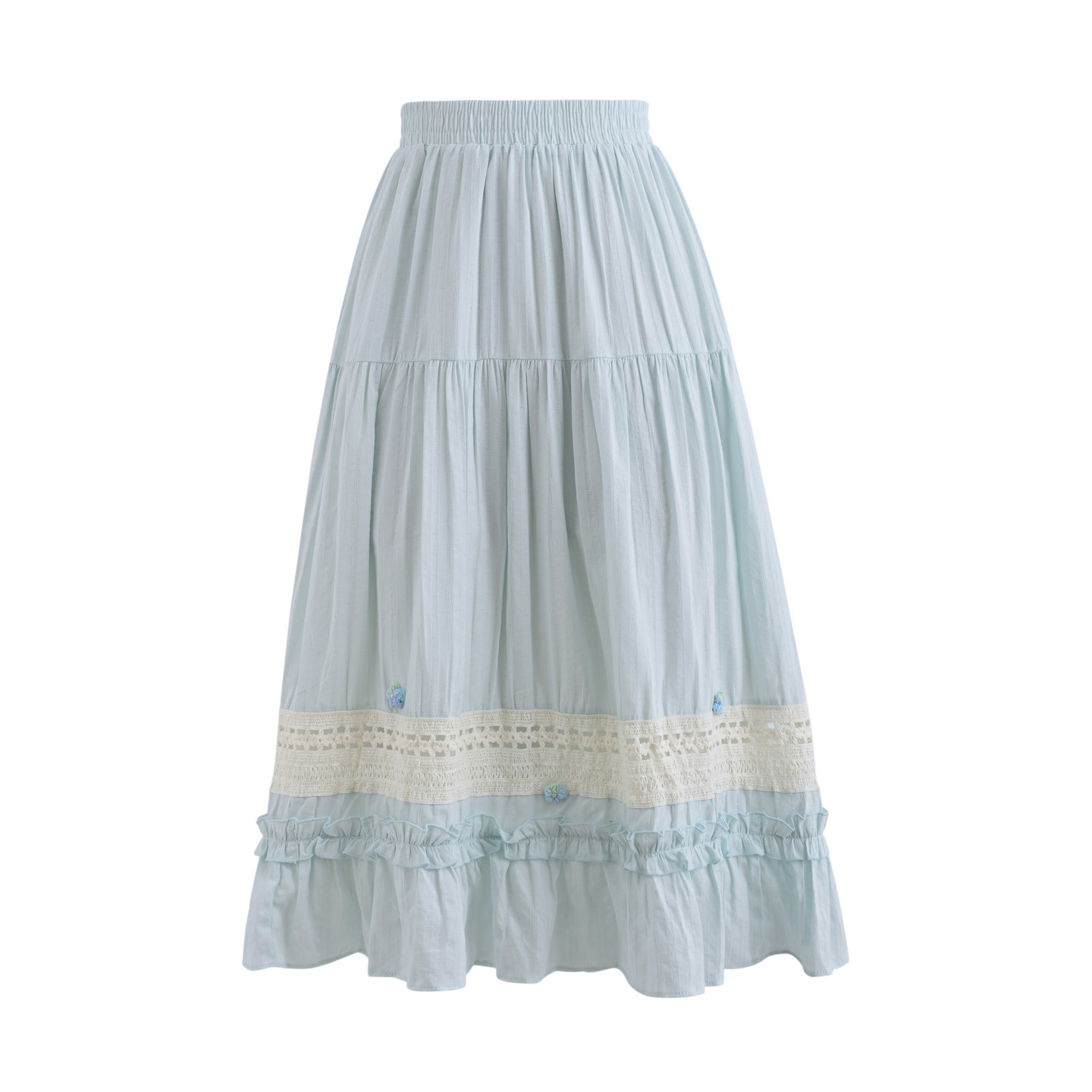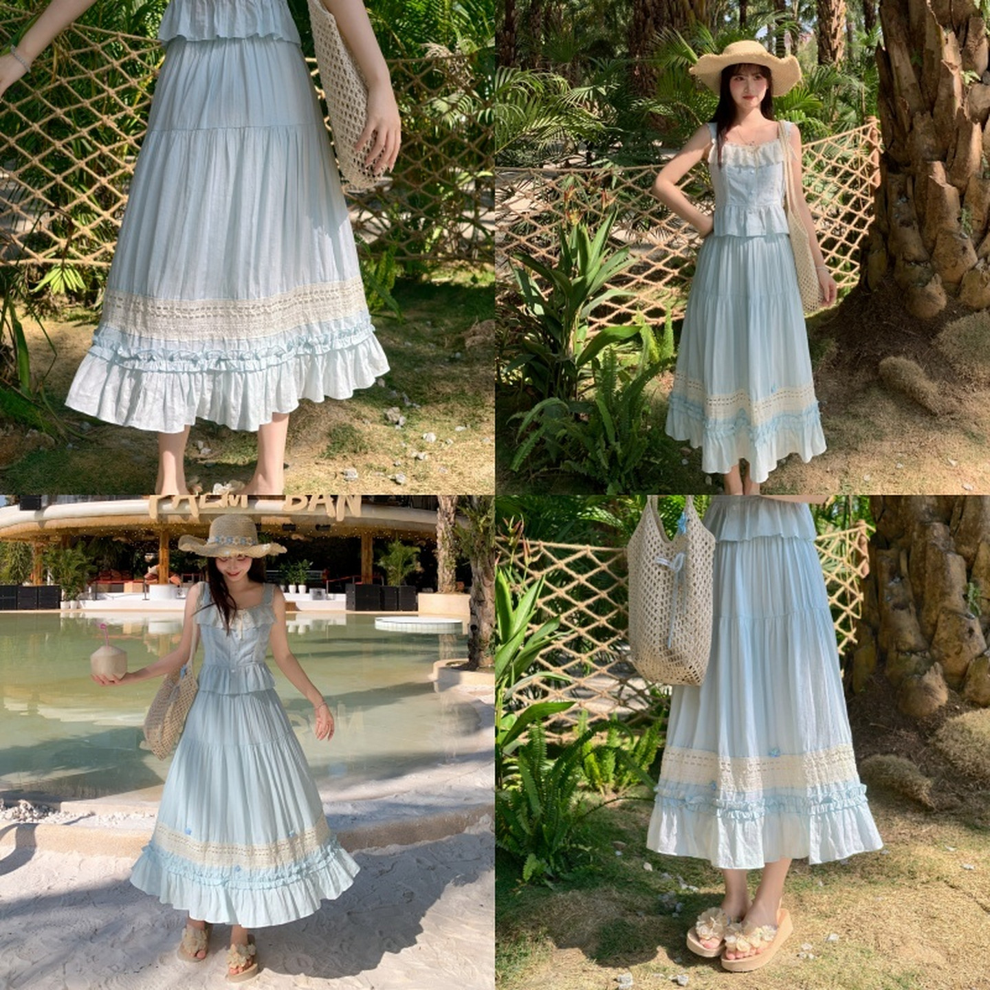 森女部落甜美蓝色高腰半身裙女新款钩花蕾丝拼接度假风A字长裙夏