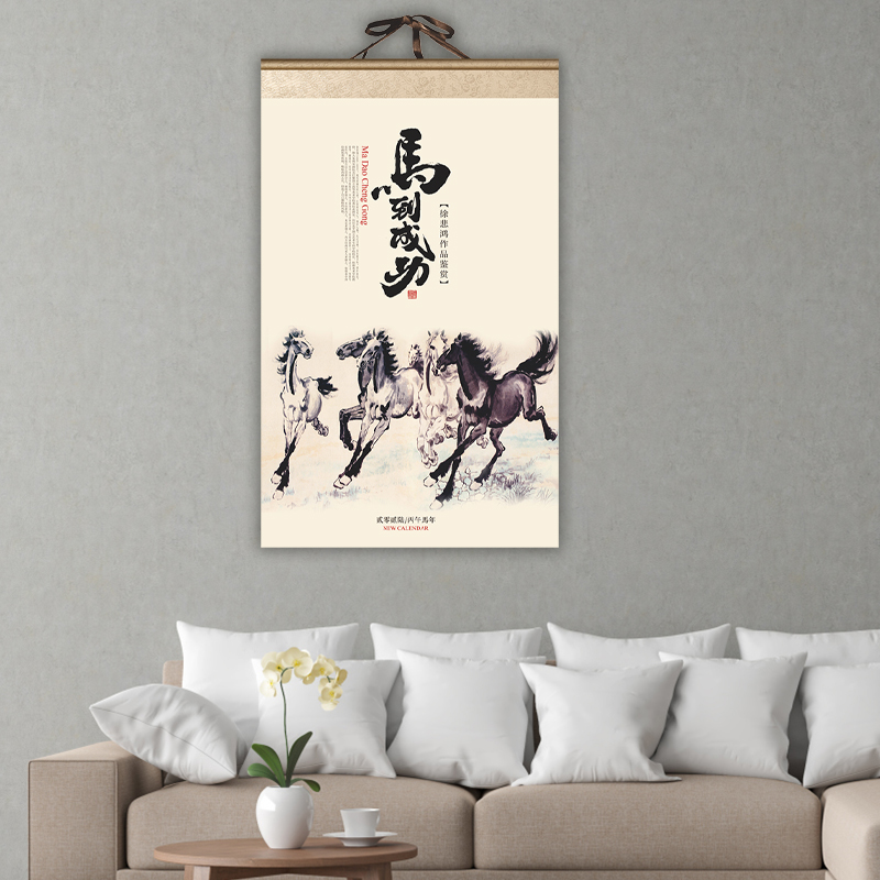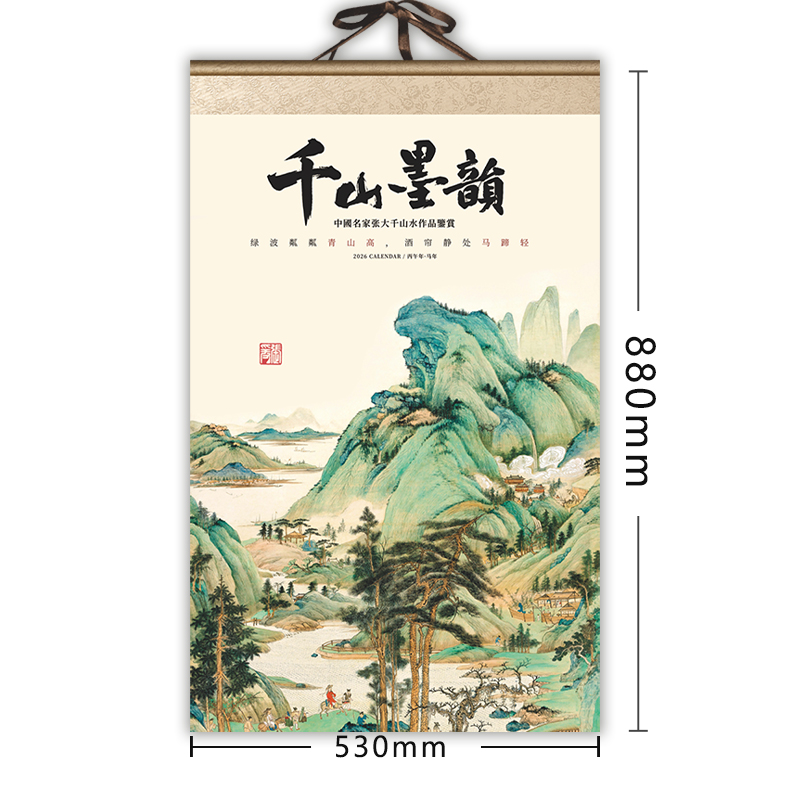 中国风国画挂历2026马年大号古风日历绢画风雅颂月历家用挂墙繁花似锦名家山水画卷轴式挂历定制企业公司LOGO