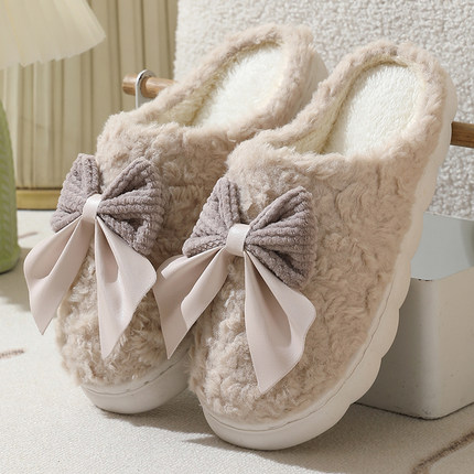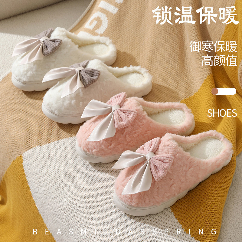 棉拖鞋女秋冬季可爱蝴蝶结厚底保暖居家居室内防滑家用毛绒月子鞋
