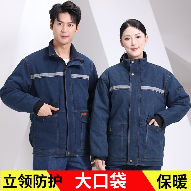 冬季加厚加绒牛仔工作服男防烫耐磨电焊工棉袄防寒保暖劳保工装男