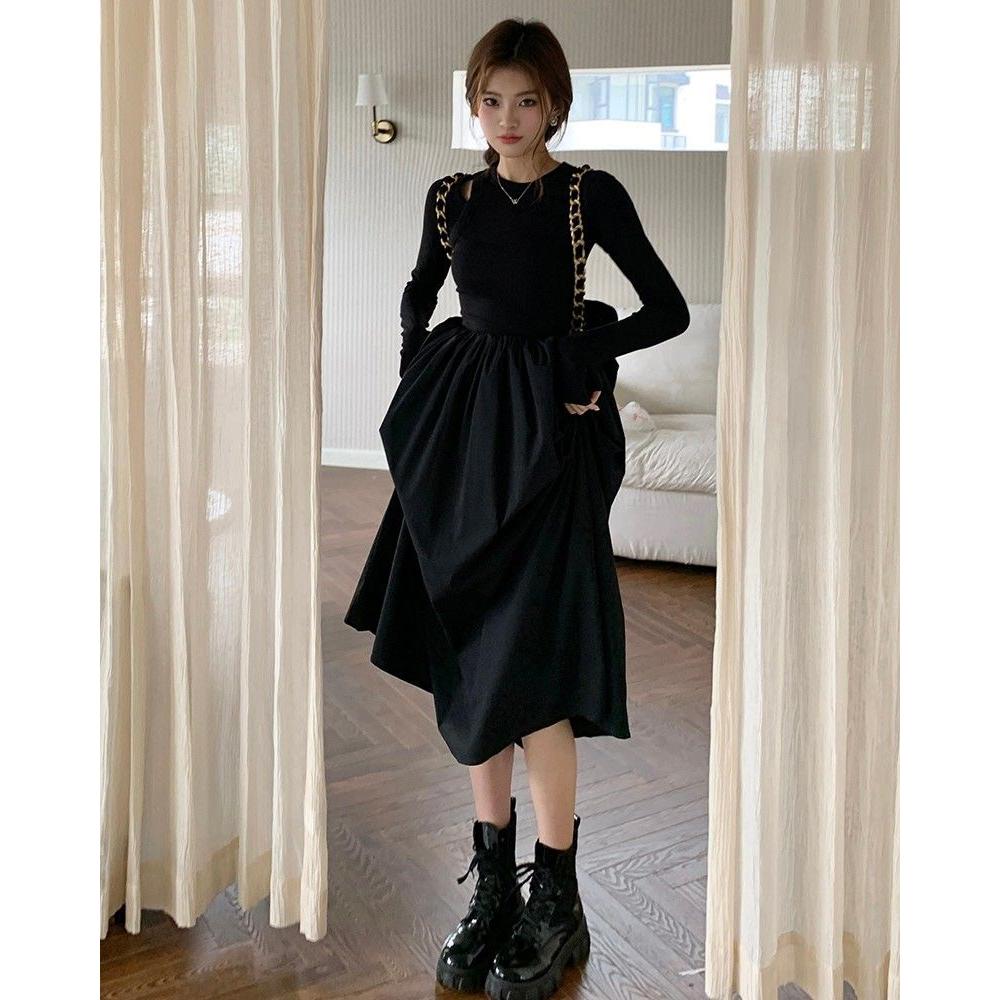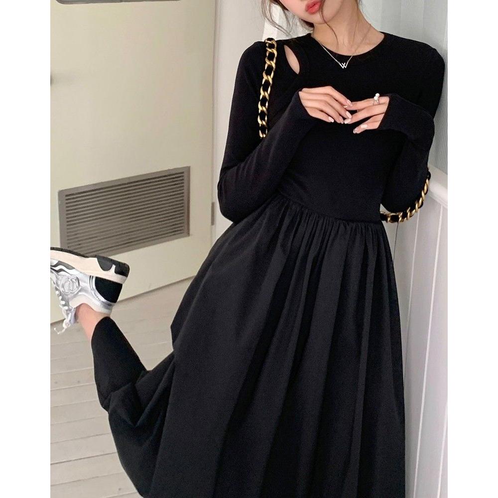 赫本风2025秋冬新款赫本风镂空长袖连衣裙女气质修身显瘦打底长裙