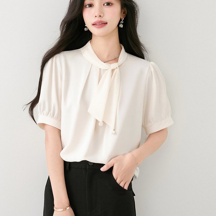 已出货蝴蝶结短袖醋酸缎面衬衫女夏季新款气质宽松套头雪纺衫上衣