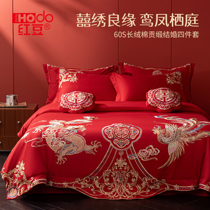 红豆全棉刺绣结婚四件套