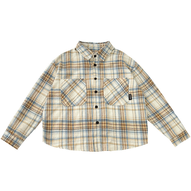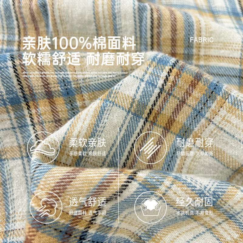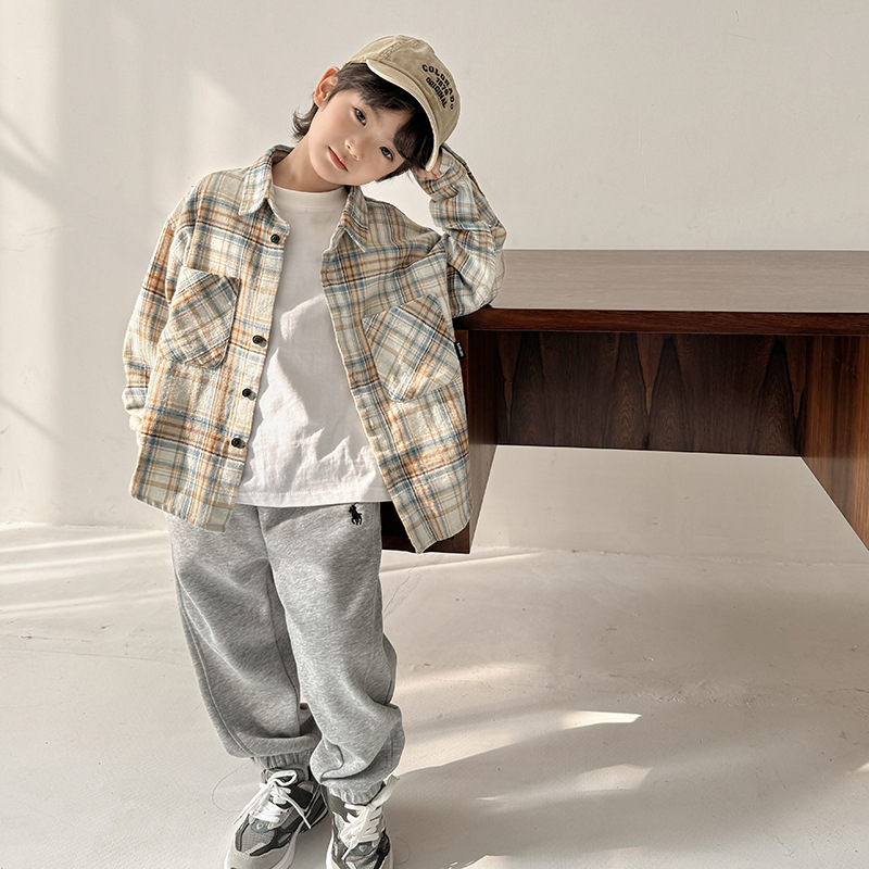 海妈家男童长袖衬衫秋季装2025新款儿童纯棉格子衬衣女童上衣