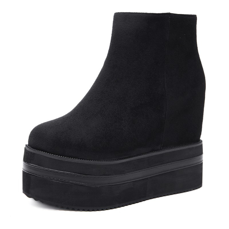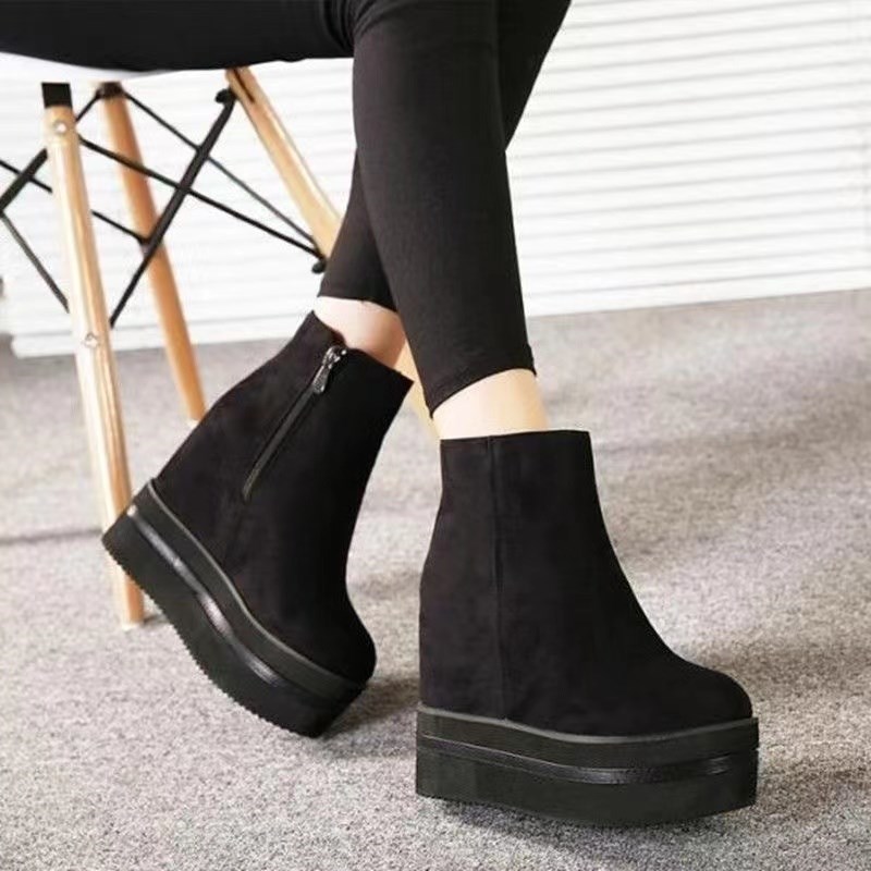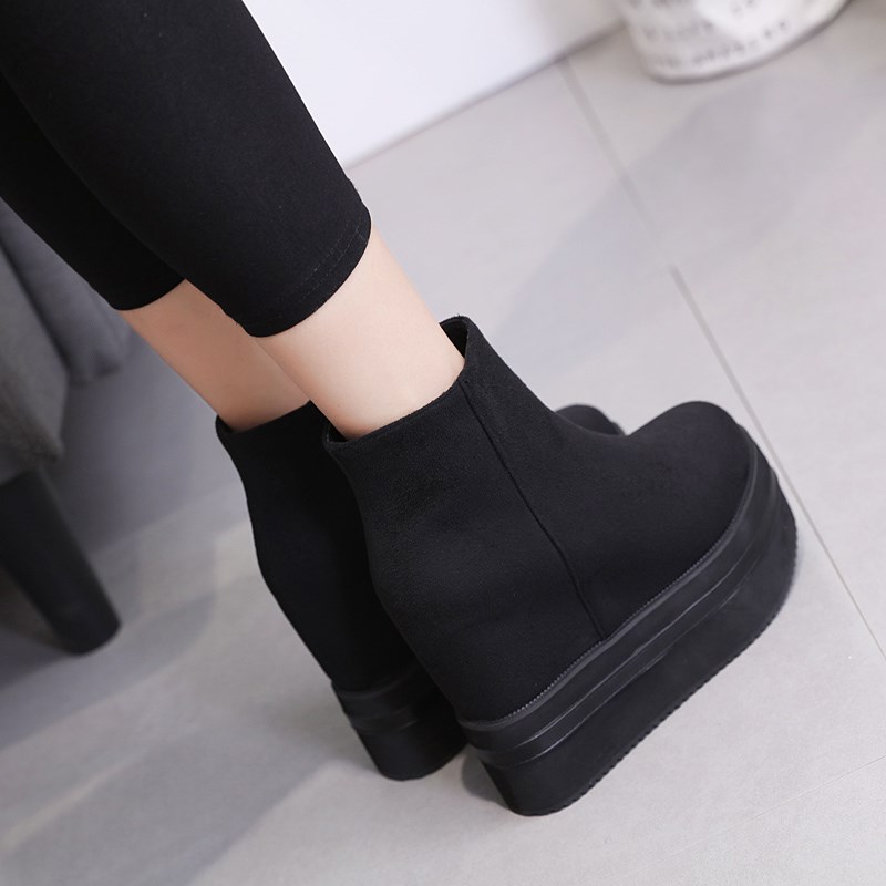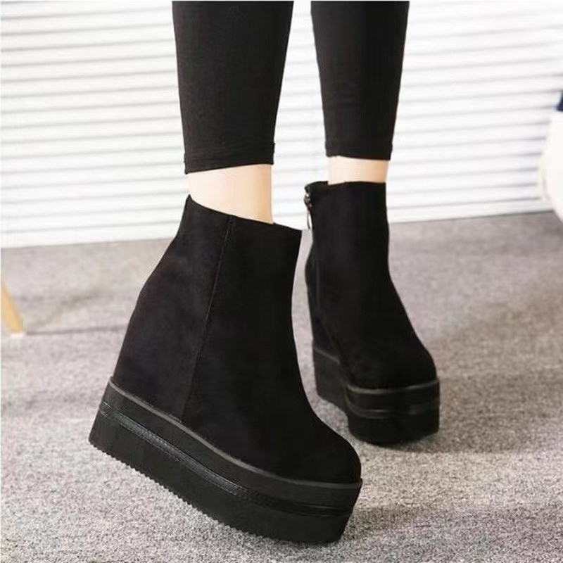 12CM坡d跟超高跟短靴防水台马丁靴小个子增高裸靴厚底加绒松糕女