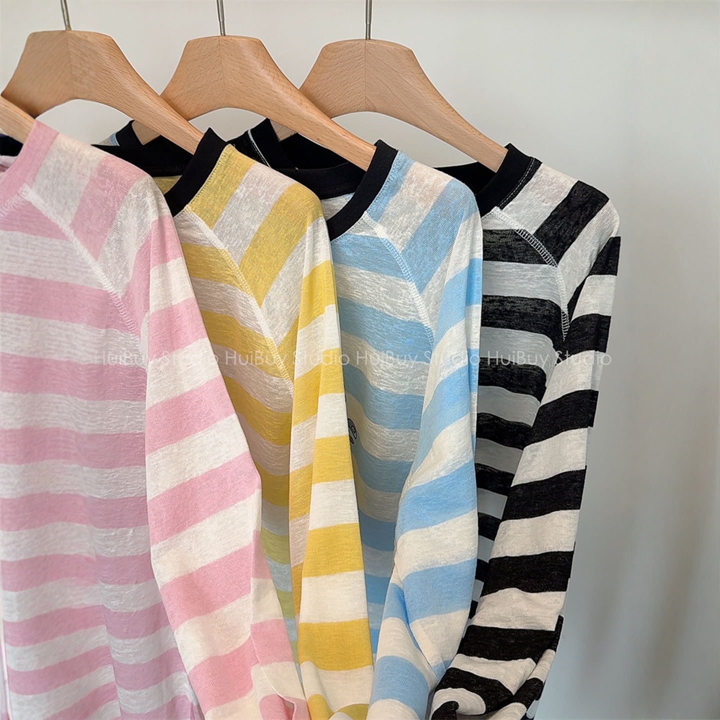 【会buy实拍】夏季新款撞色条纹长袖T恤女薄款宽松防晒罩衫上衣潮