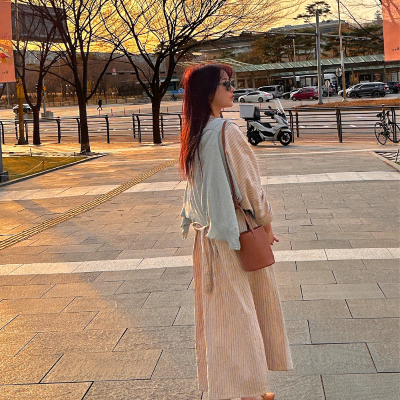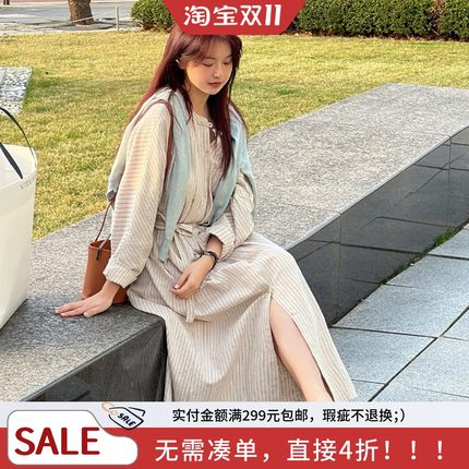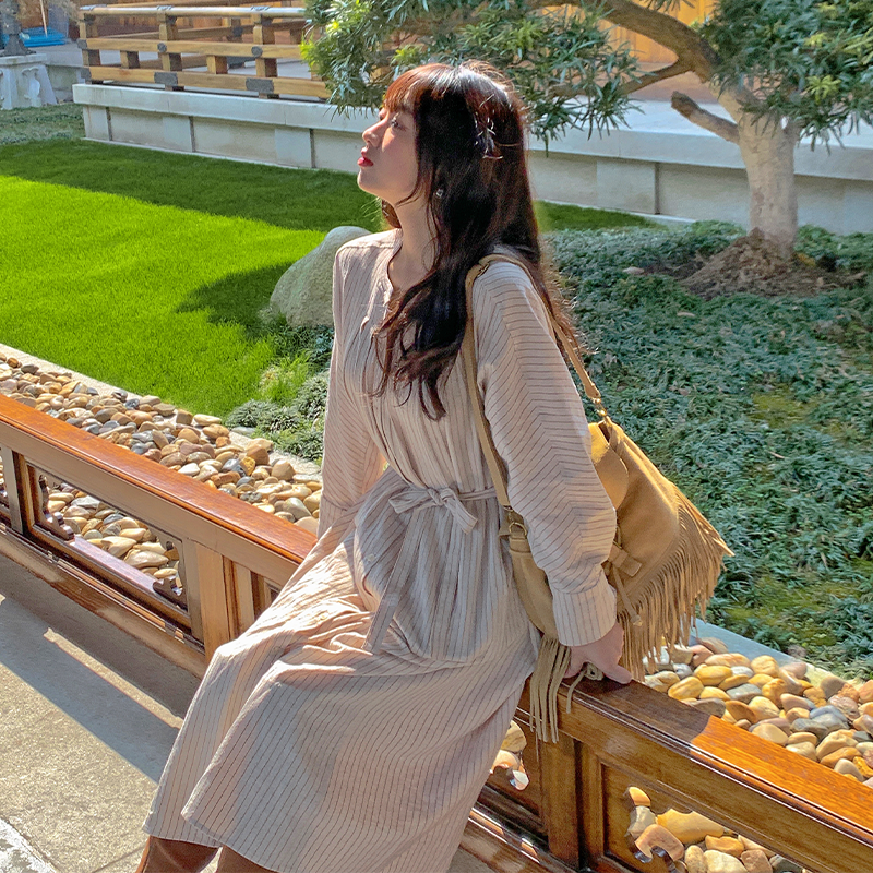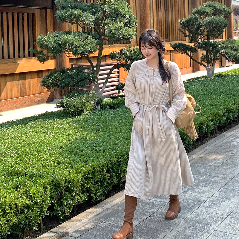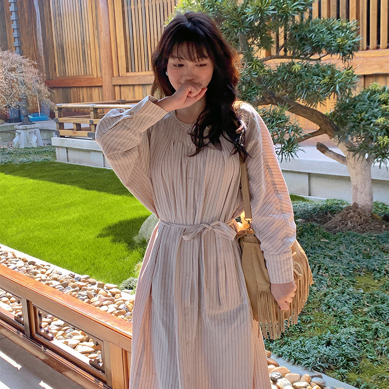 午后微光 大人气新中式盘扣纸片人条纹衬衫棉麻连衣裙《momonaco