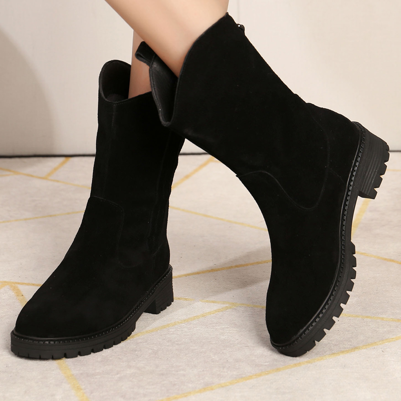 磨砂皮休闲女靴平跟厚底中筒靴东北加绒靴子保暖软底雪地棉靴冬鞋