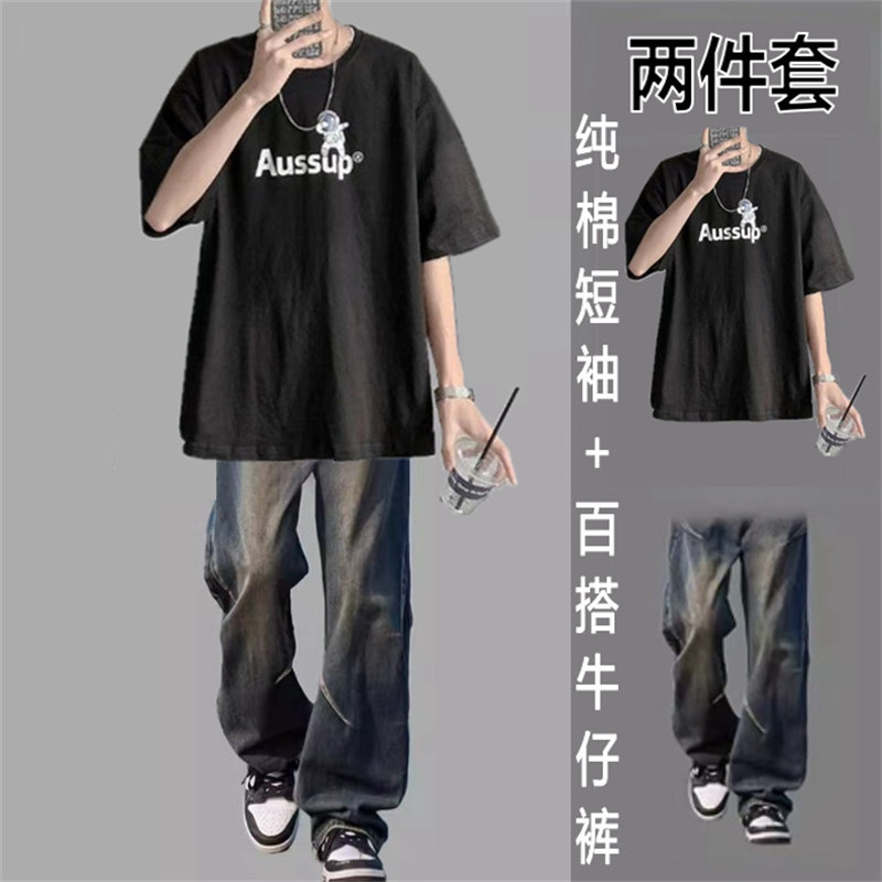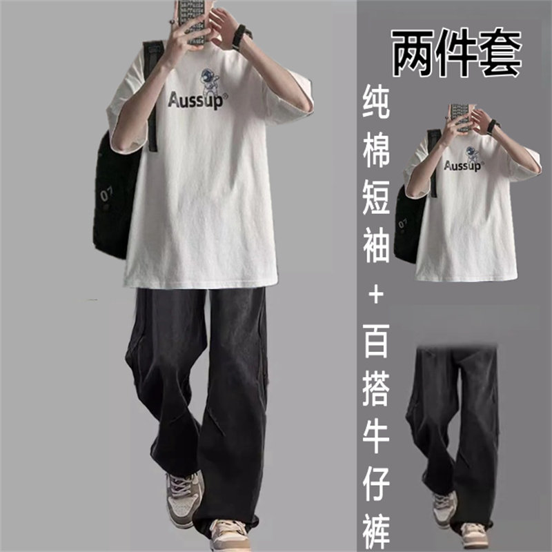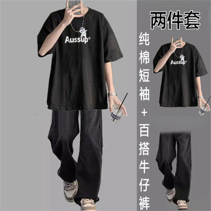 男夏季纯棉T恤短袖薄款休闲运动套装学生牛仔裤韩版阔腿痞帅男生