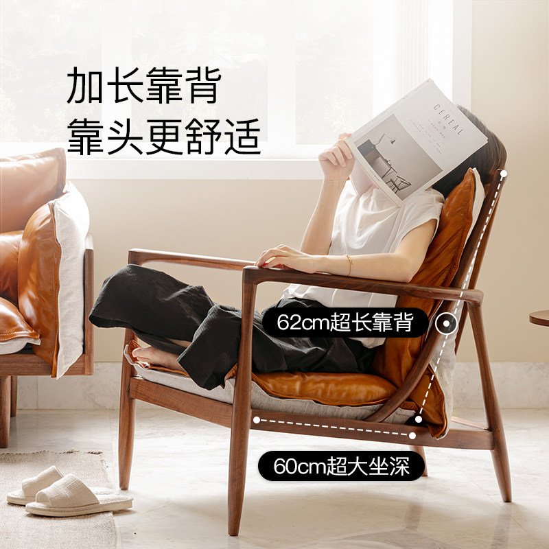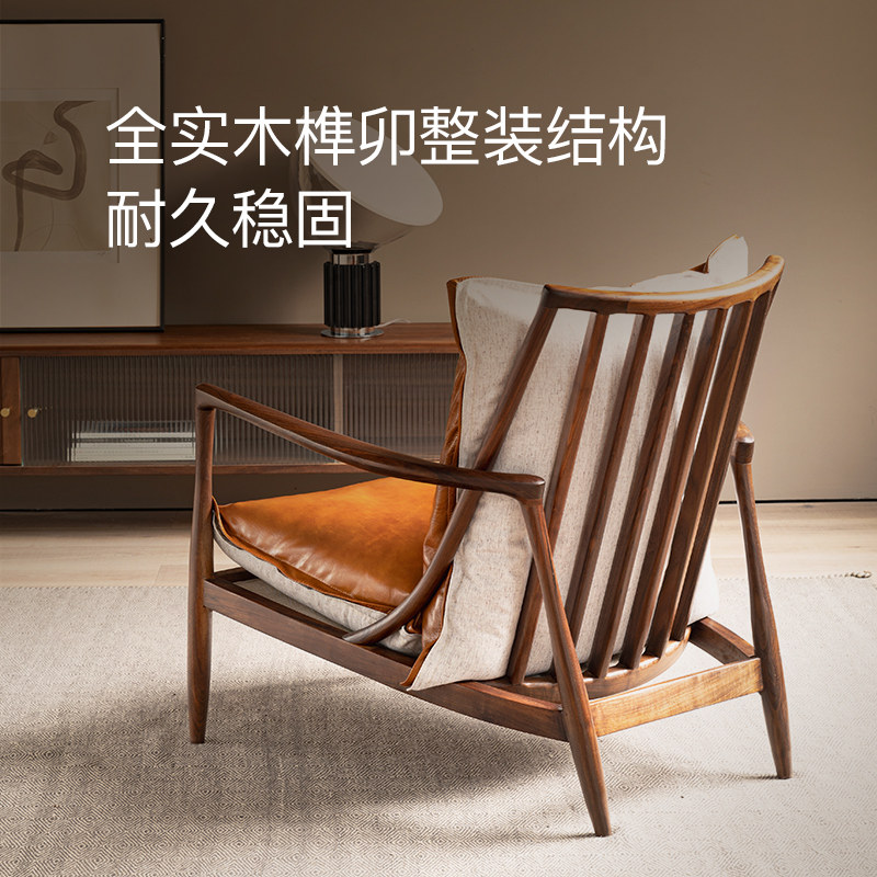 北欧轻奢单人扶手椅头层牛皮黑胡桃木实木家具椅良年MK现代沙发椅