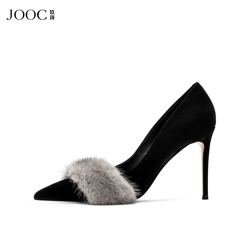 JOOC玖诗细跟高跟鞋2025当季热卖水貂毛气质单鞋尖头浅口名媛女鞋