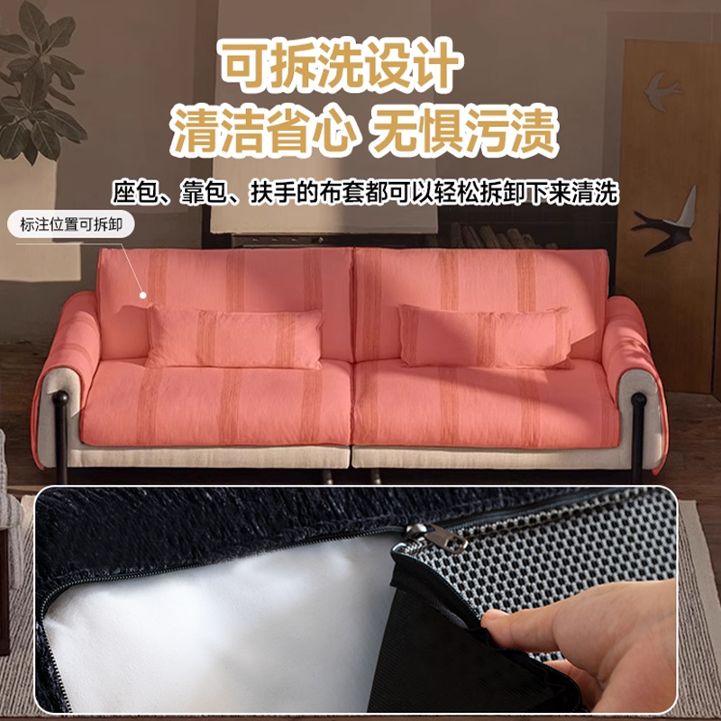中古风原野沙发简约条纹布艺法式复古客厅实木可拆洗亚麻直排沙发