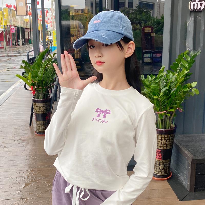 女童长袖T恤白色2025春季秋新儿童纯棉打底衫上衣中大童圆领洋气
