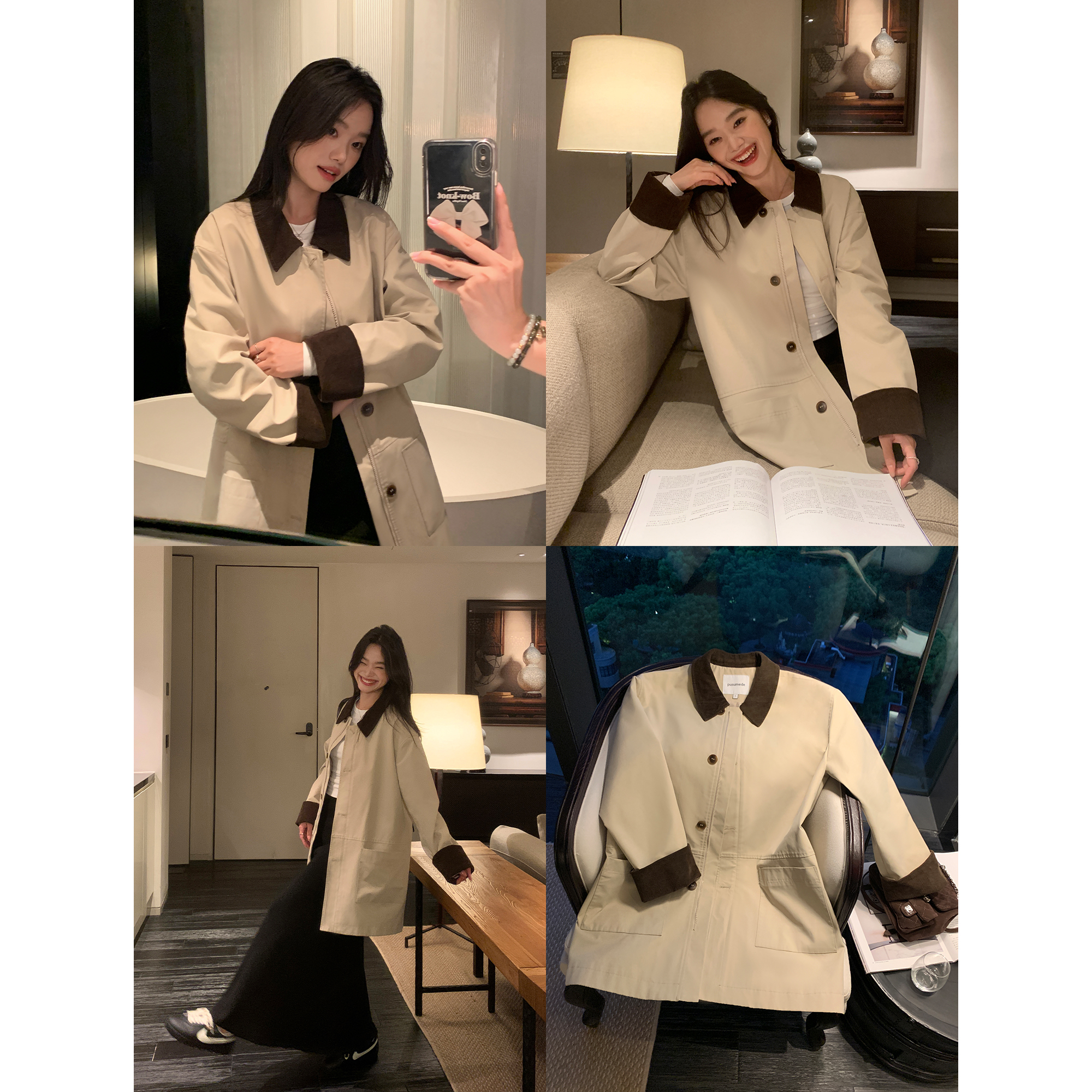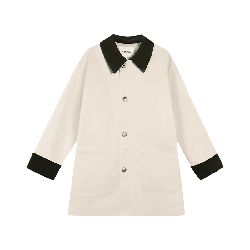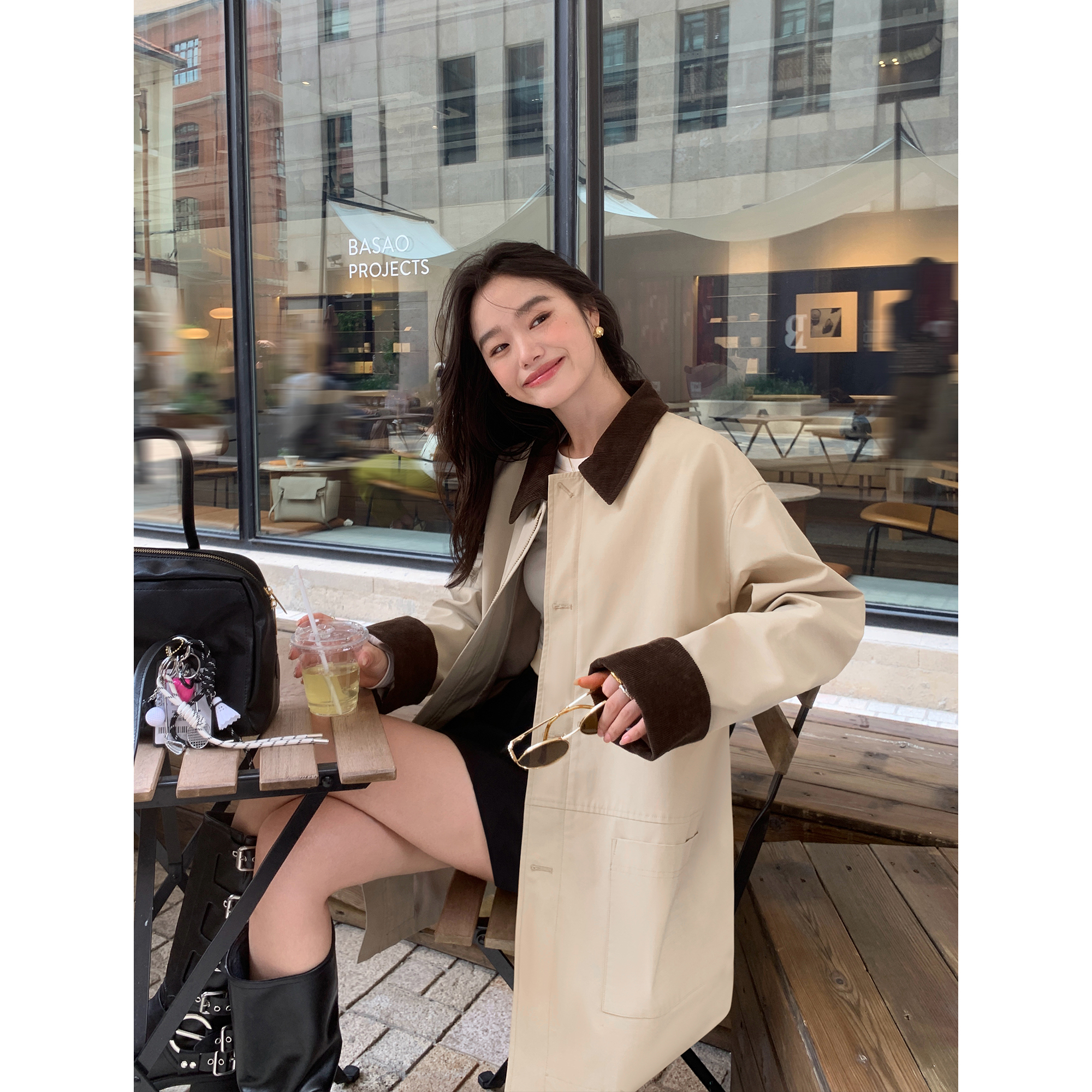 pusumede 都市周末 设计感撞色拼接风衣外套女翻领宽松中长款大衣