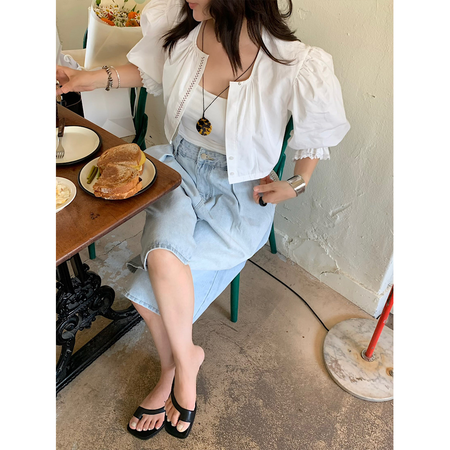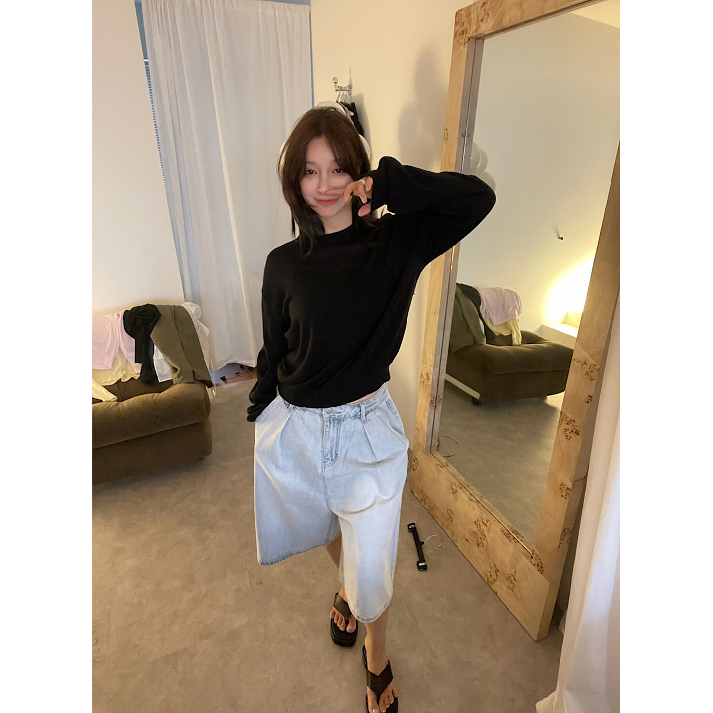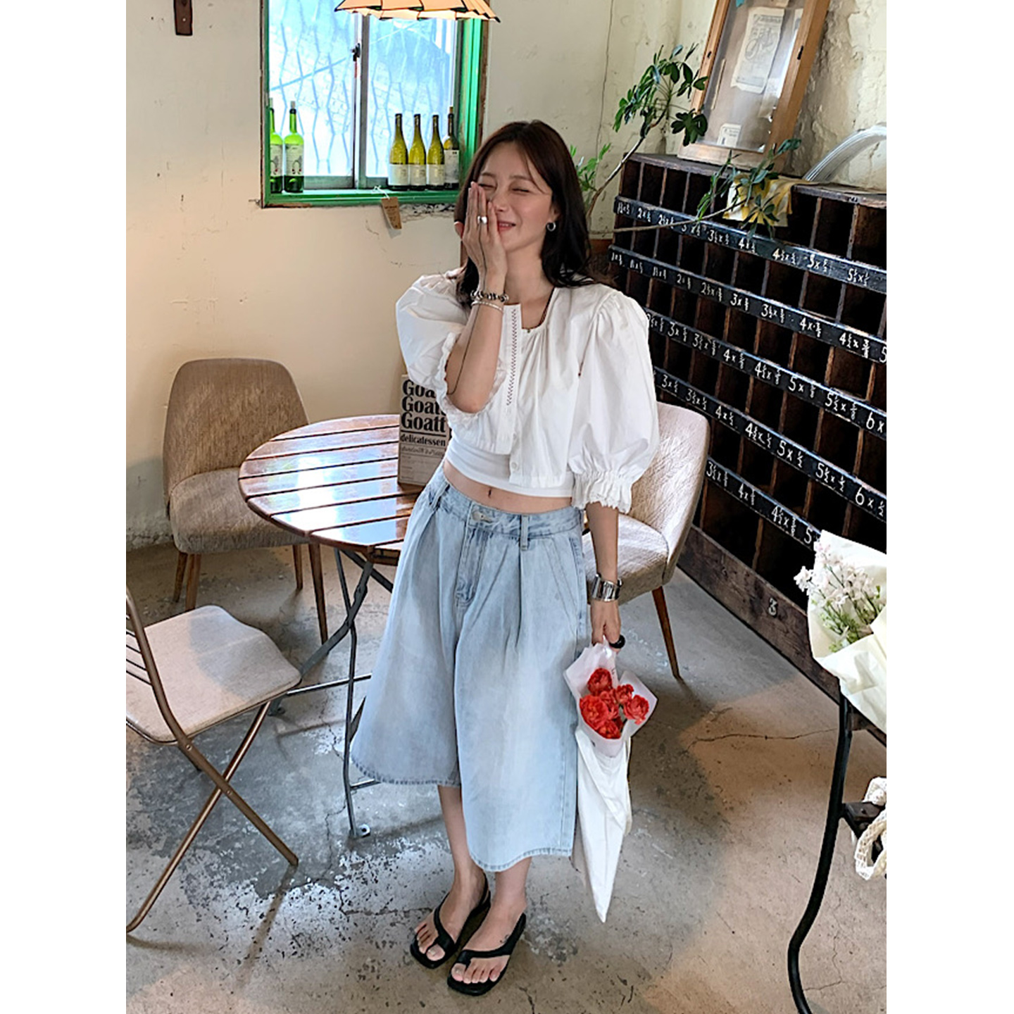 鬼鬼家正品韩代东大门 25夏时髦简约浅色百搭高腰牛仔阔腿七分裤