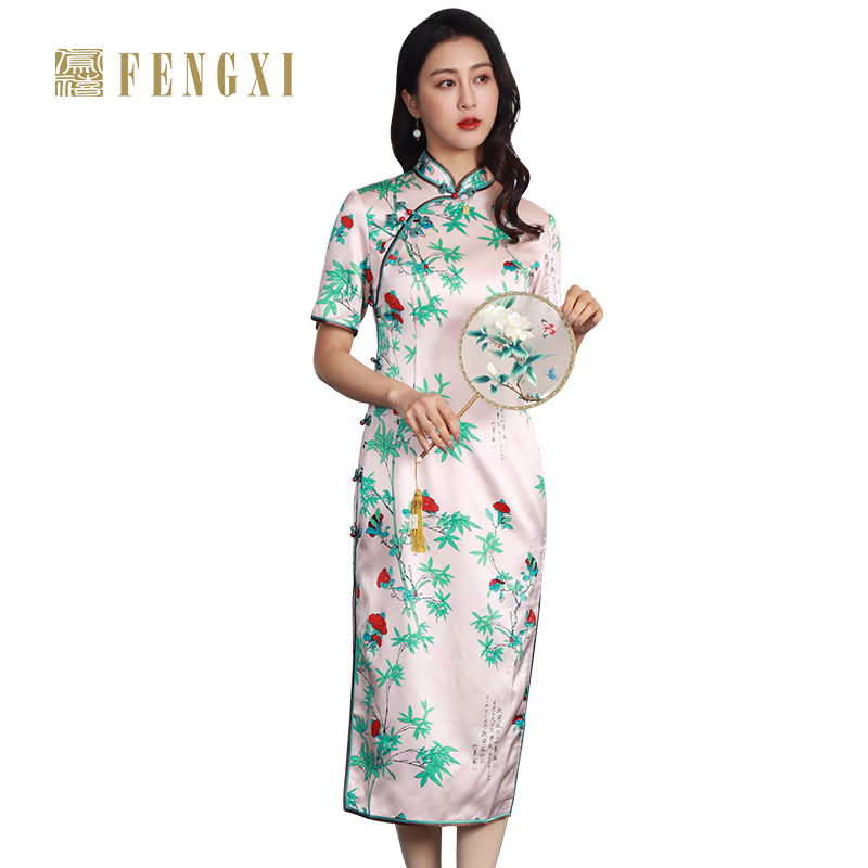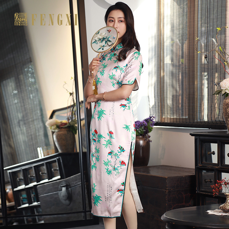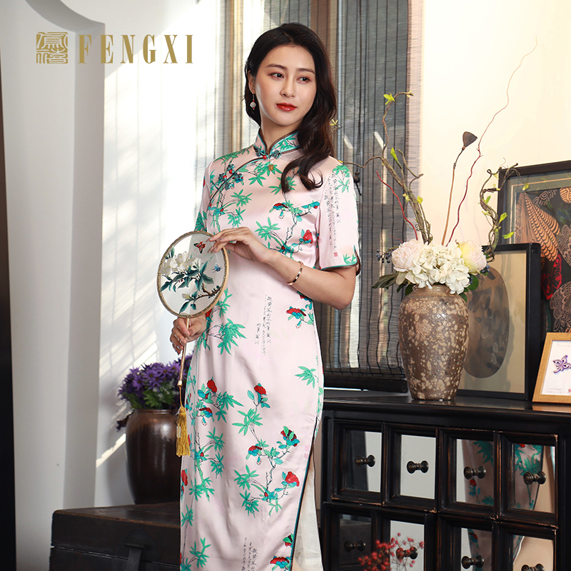 凤禧旗袍2023年新款春夏真丝缎长款旗袍印花端庄中袖桑蚕丝高端女