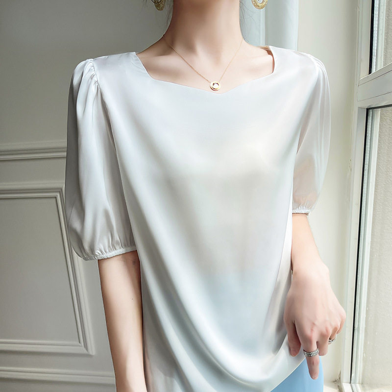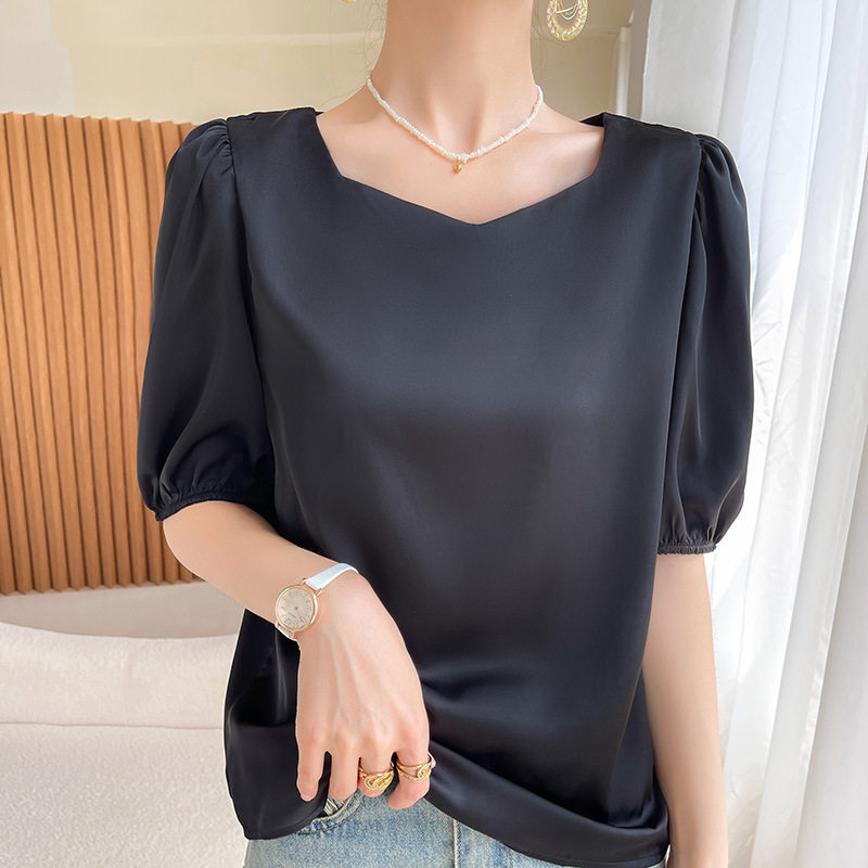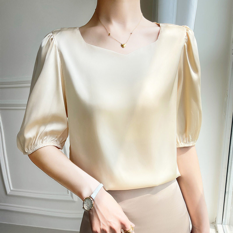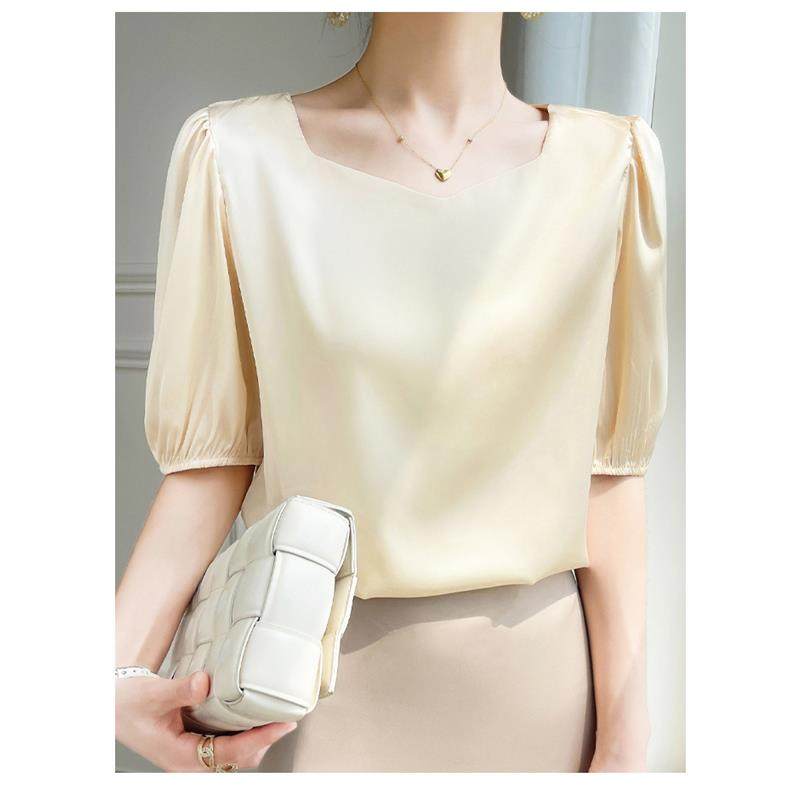 正品哥家新2025夏新款法式泡泡袖真丝雪纺衬衫女显瘦五分袖上衣