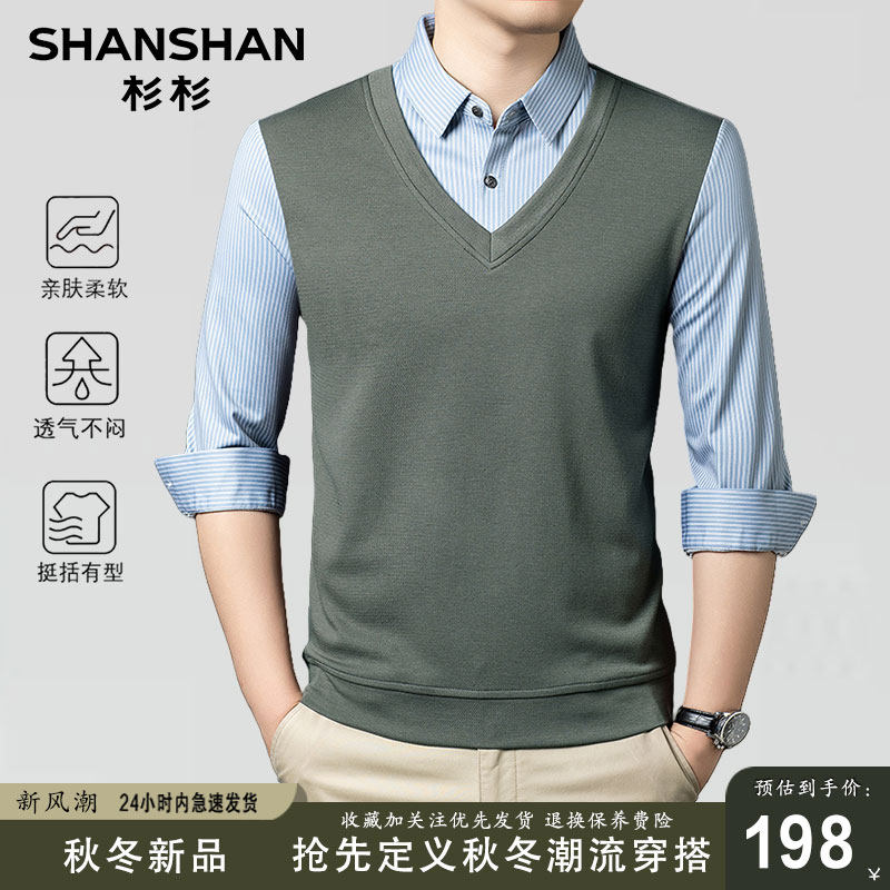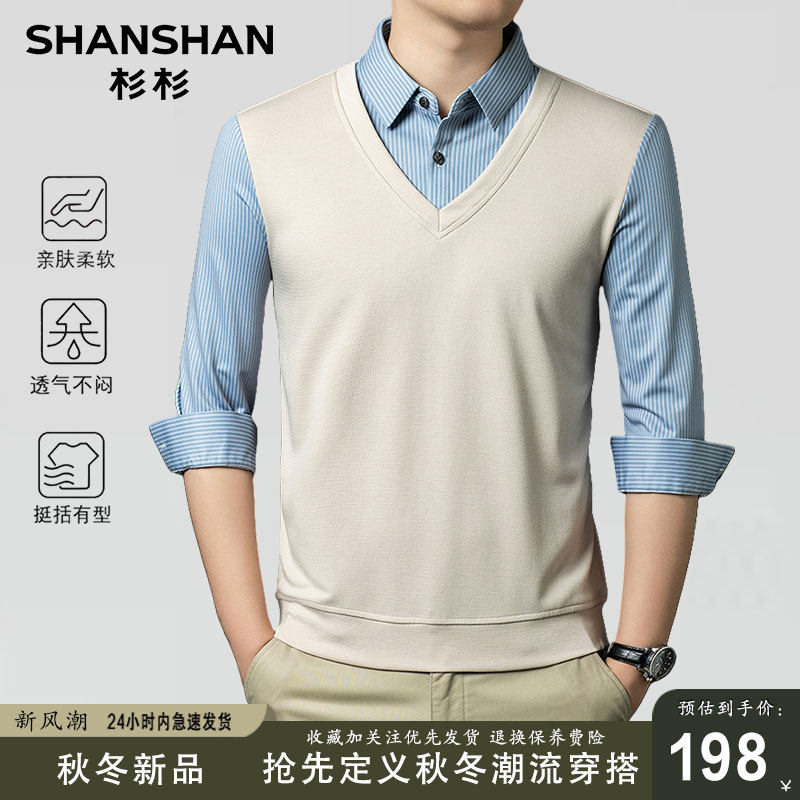 杉杉新款秋冬假两件针织衫V领条纹长袖男士休闲T恤韩版潮流打底衫