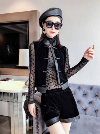 金丝绒复古立领中国风短上衣丝绒马甲背心外套搭阔腿短裤两件套女