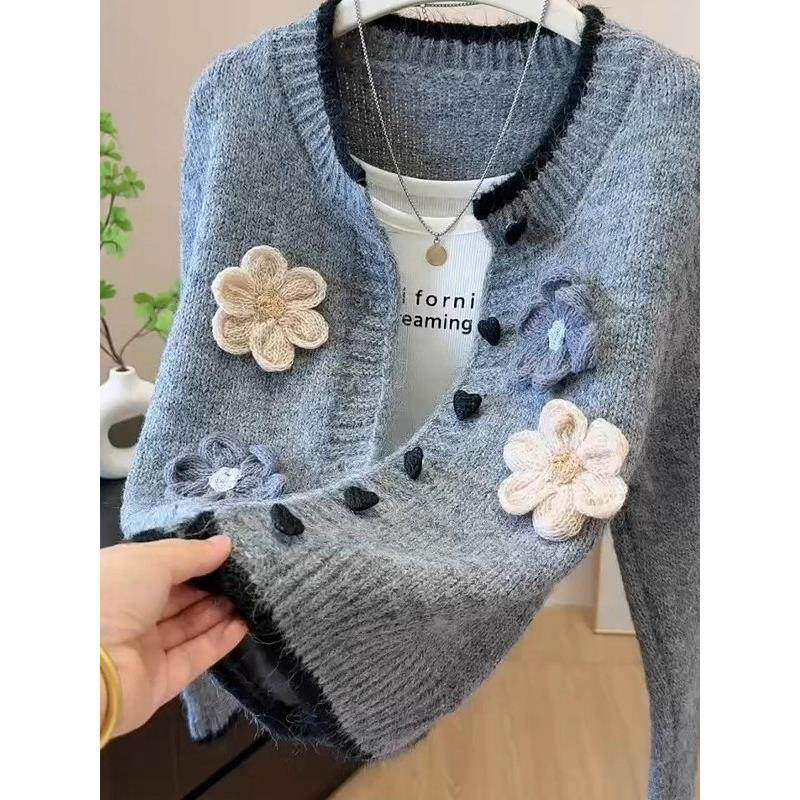立体花朵温柔风爱心扣针织开衫秋季新款单排扣洋气百搭毛衣外套女