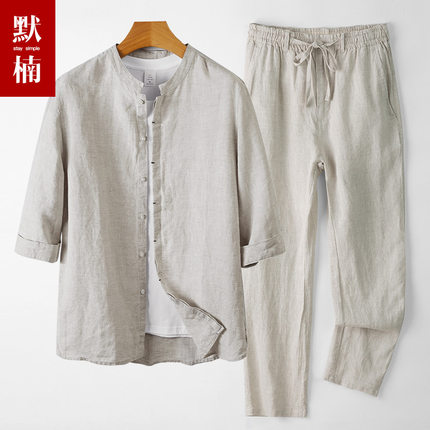 中国风100%亚麻衬衫男七分袖唐装中式棉麻休闲薄衬衣夏季两件套装