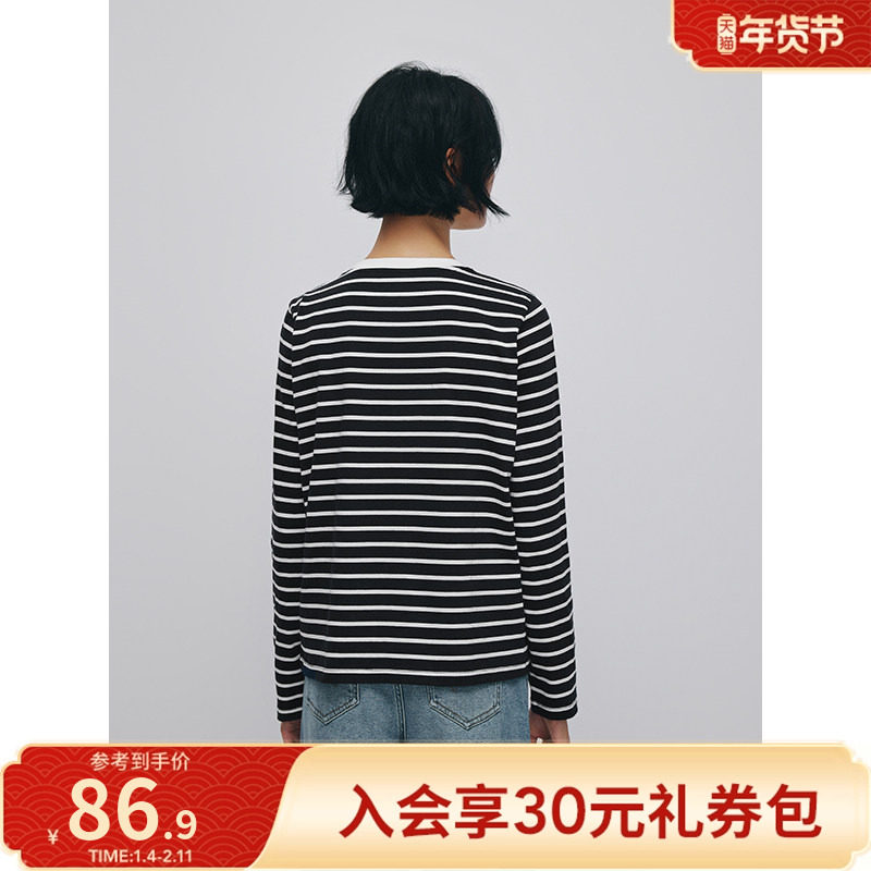 热风女士条纹长袖T恤2025年秋季新款休闲基础款圆领纯棉t恤上衣