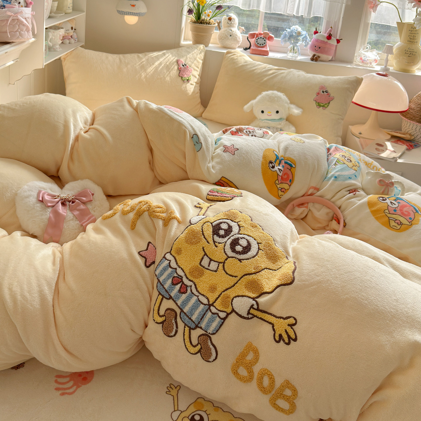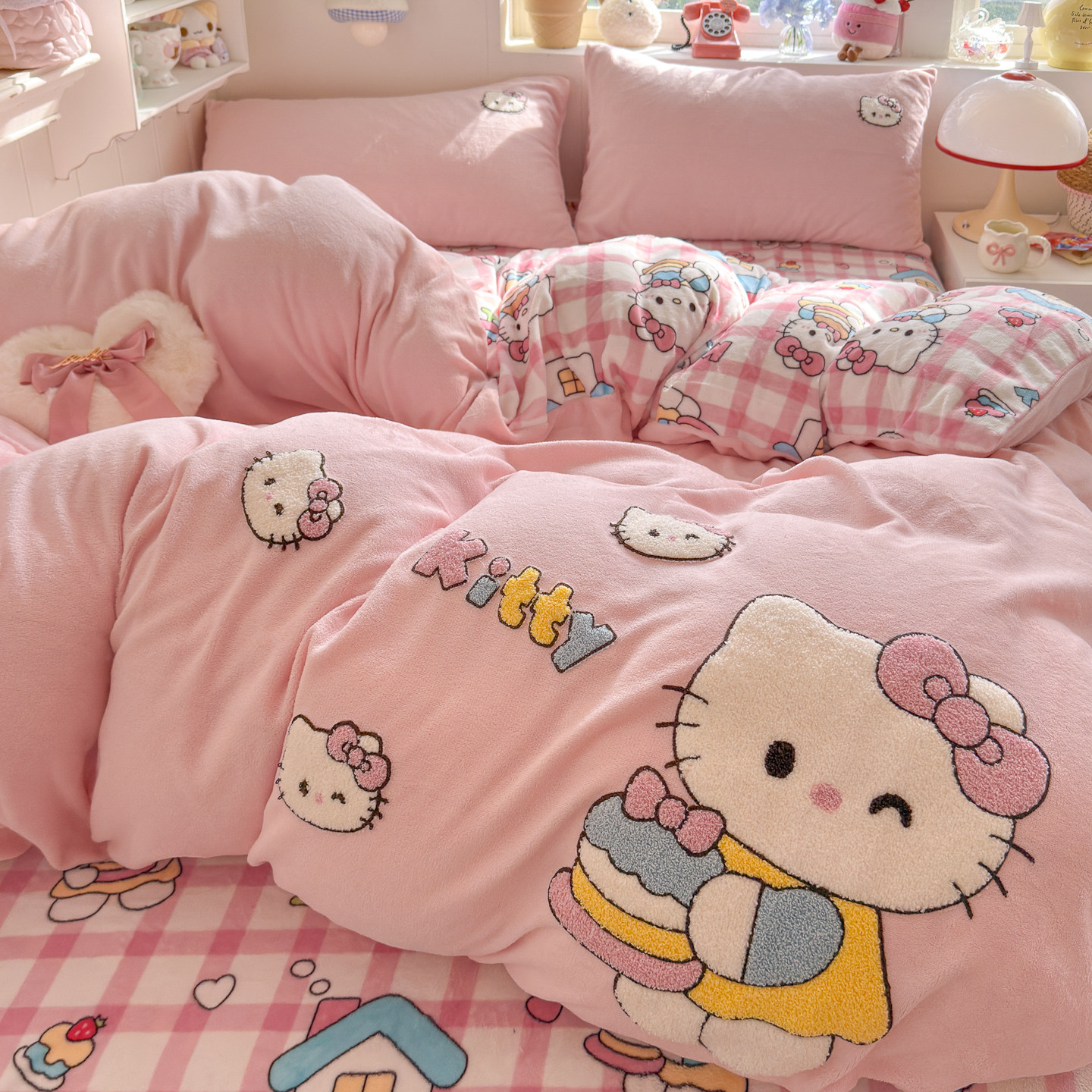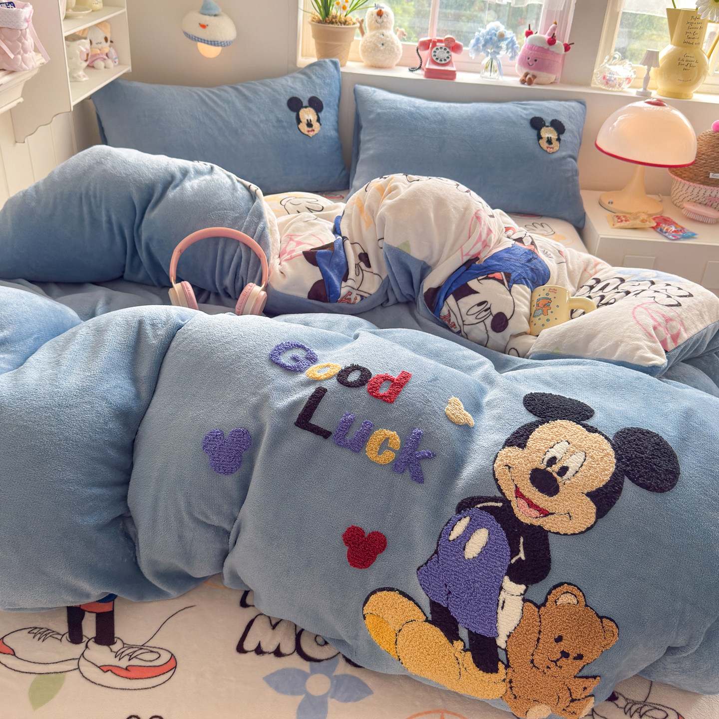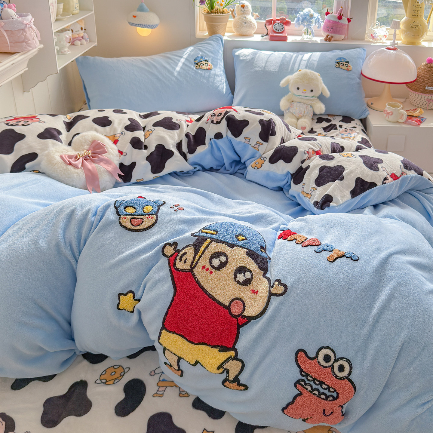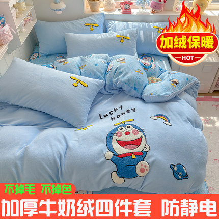 哆啦A梦牛奶绒床上四件套儿童床单被套冬季卡通珊瑚绒三件套床笠