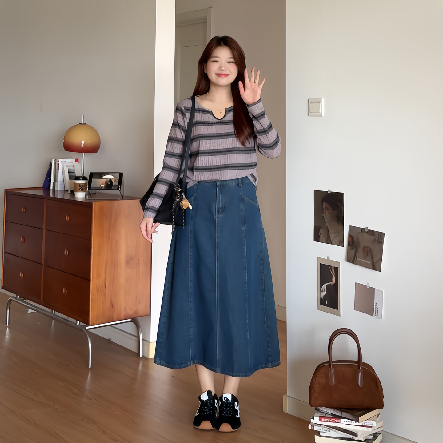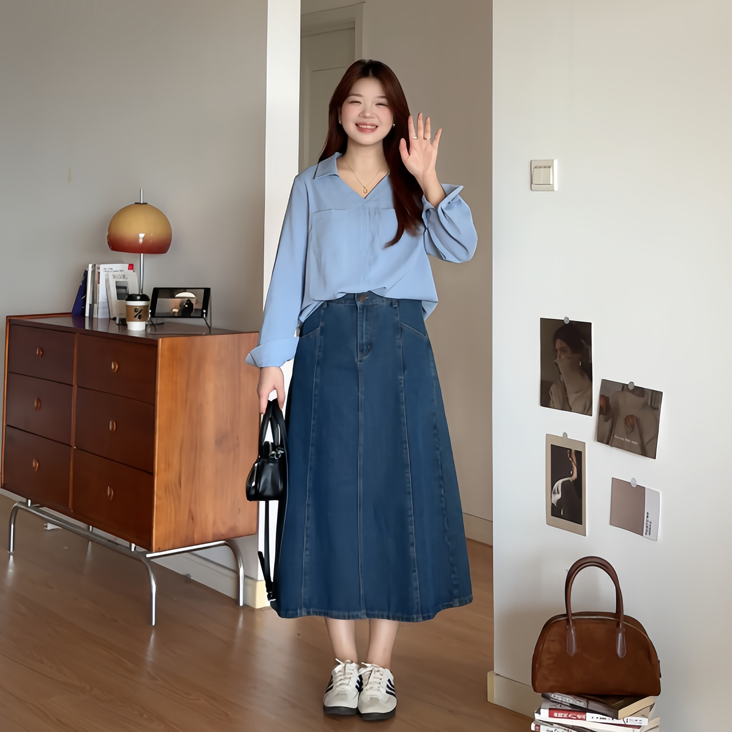 微胖的喵喵 大码女装微胖mm早秋通勤巨显瘦穿搭遮胯a字牛仔半身裙