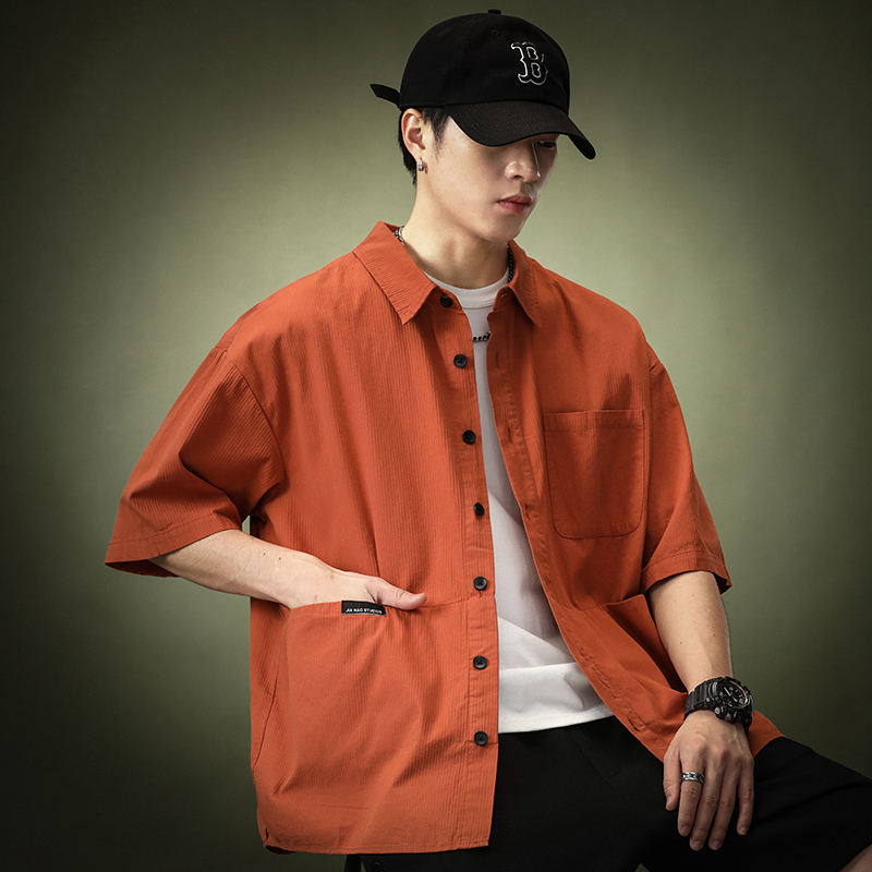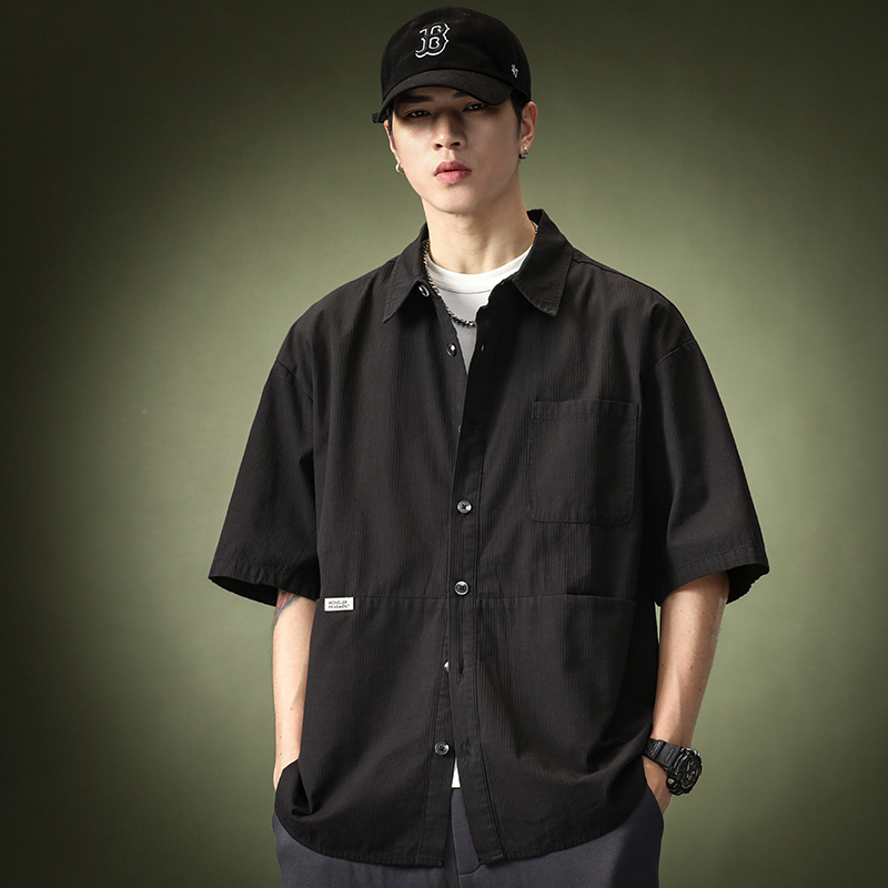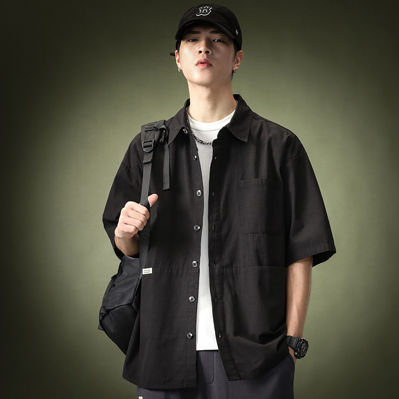 美式工装短袖衬衫男夏季ins潮牌宽松半袖上衣山系复古T恤多袋衬衣
