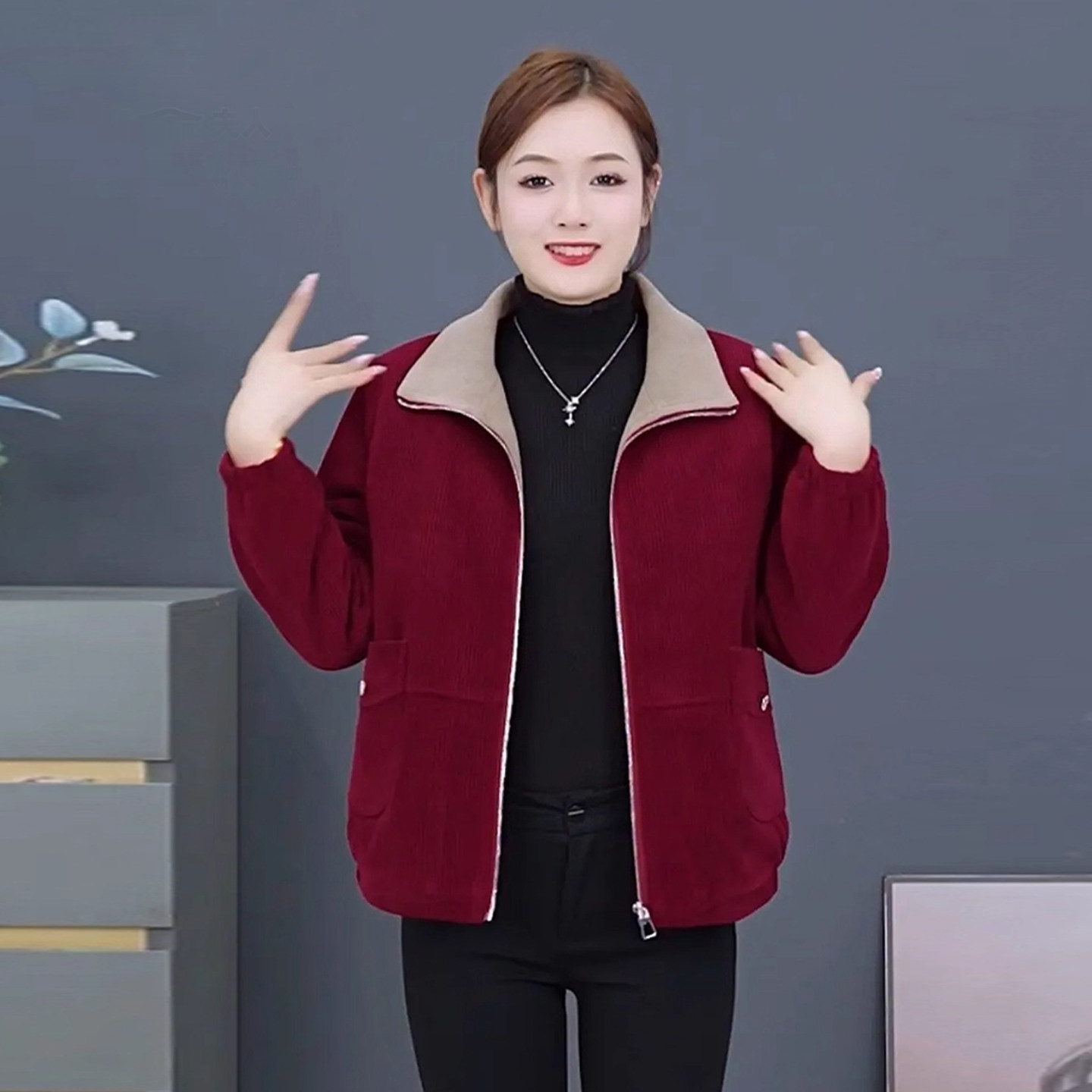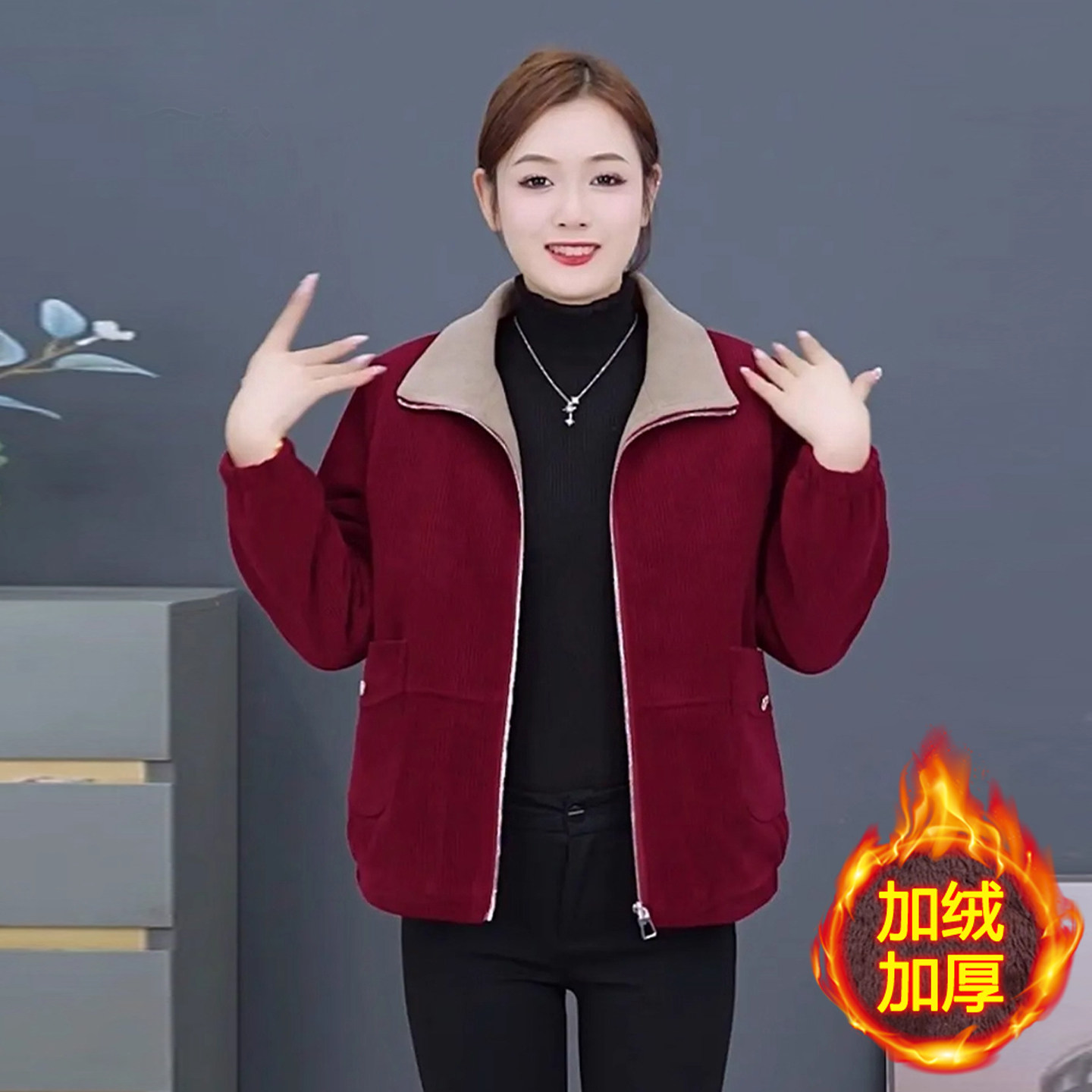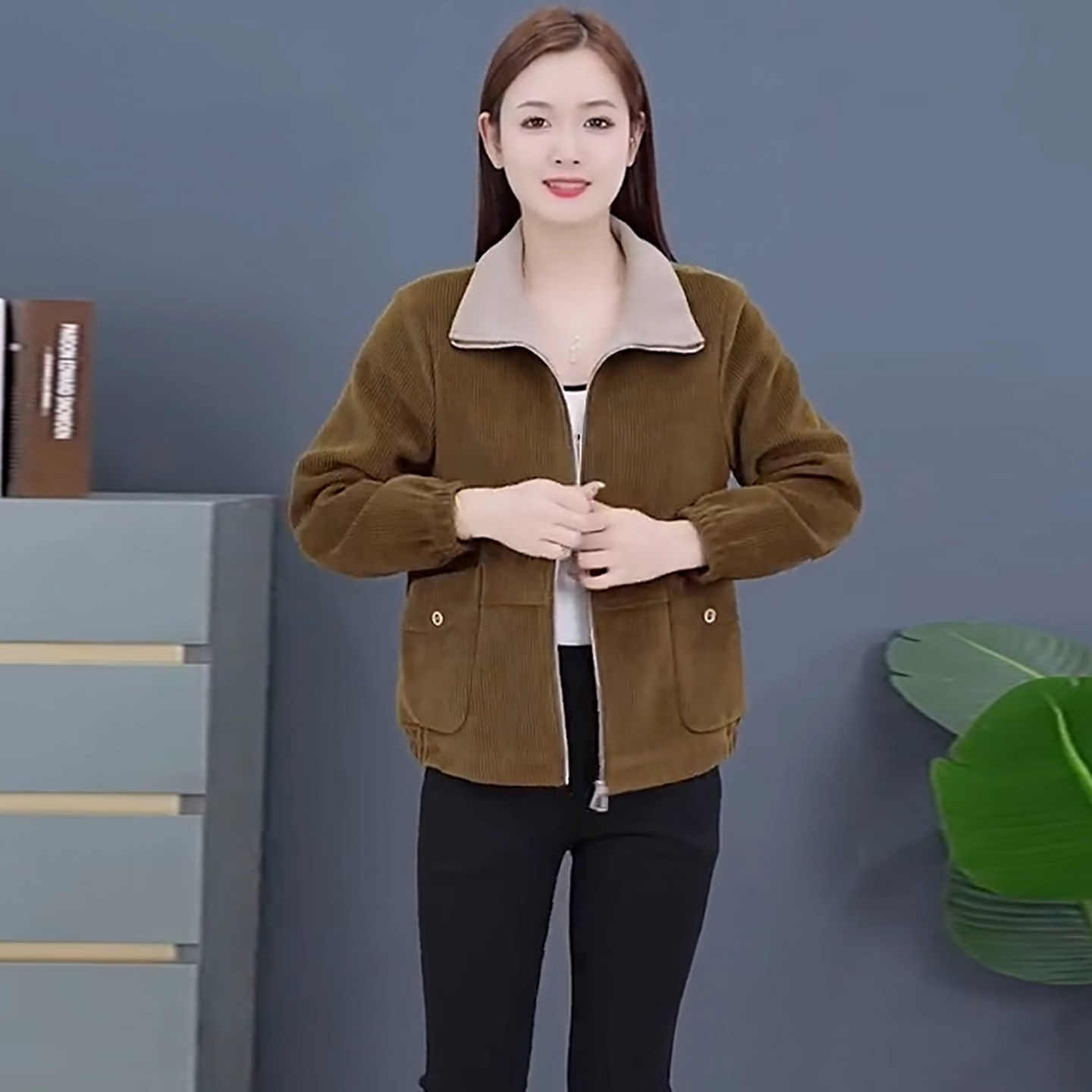 时尚女装灯芯绒短外套秋冬加绒保暖大码夹克衫妈妈装复古条绒上衣