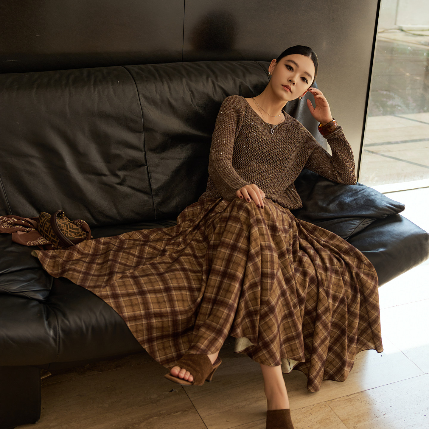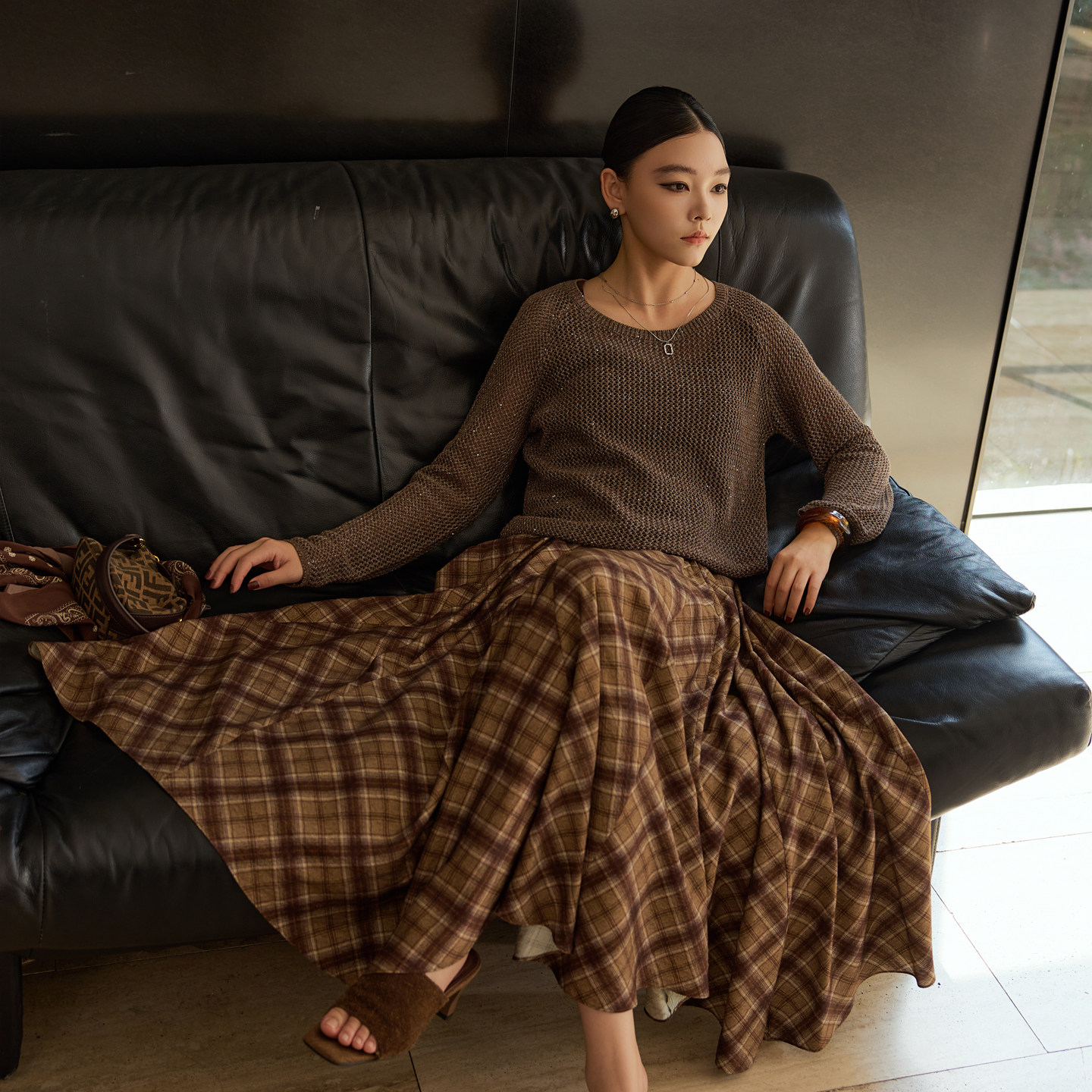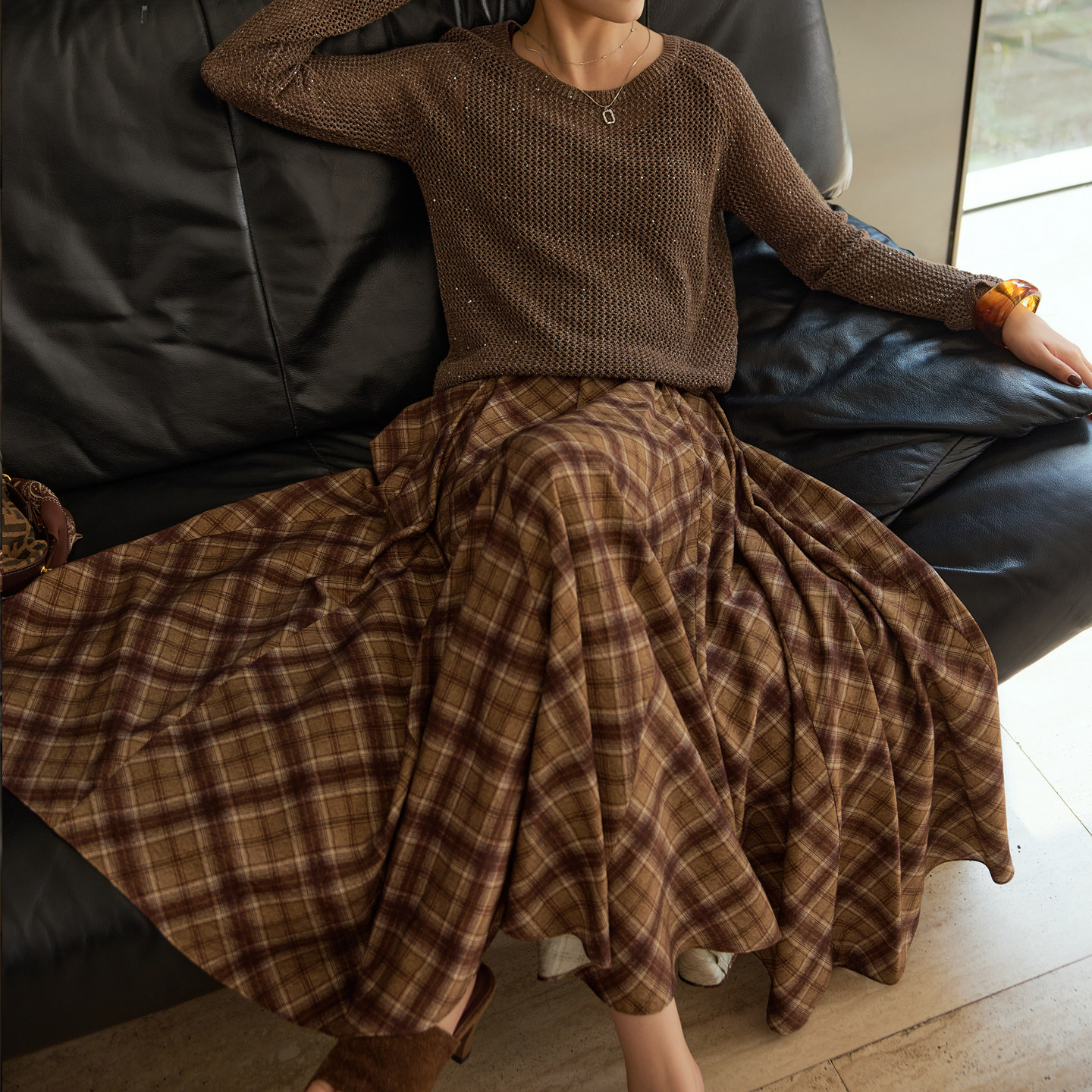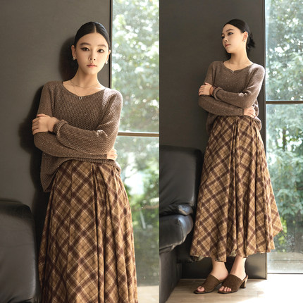 复古亚麻针织衫格纹半身裙两件套