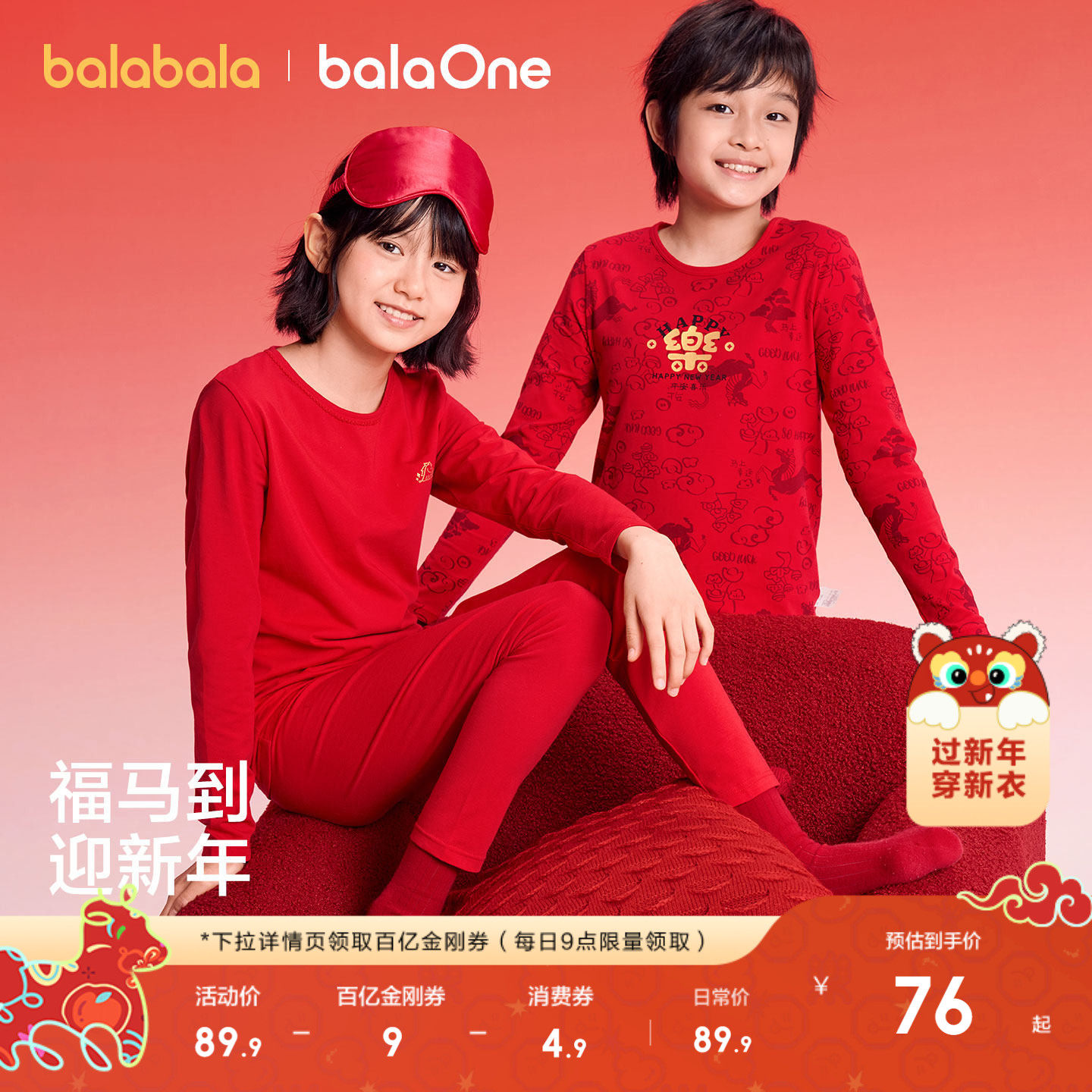 巴拉巴拉儿童内衣套装男女童秋衣秋裤宝宝保暖衣新年季红色拜年服