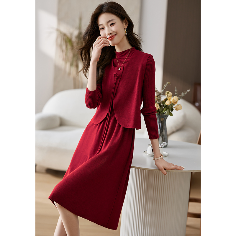 秋冬高级感羊毛套装女新款针织羊绒短马甲新中式打底毛衣裙两件套