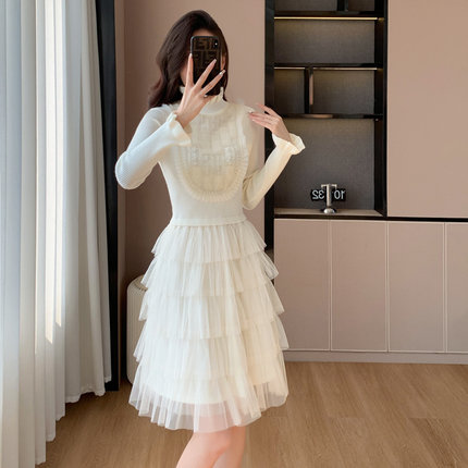秋冬新款时尚洋气蕾丝亮片修身显瘦蛋糕裙中长款拼接网纱连衣裙