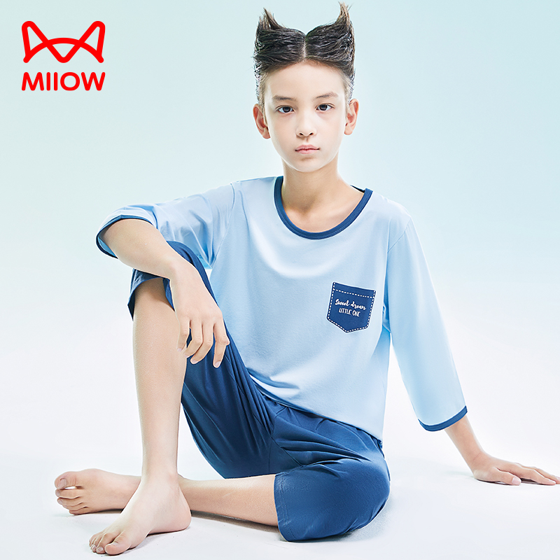 猫人莫代尔男童睡衣男孩大童短袖儿童空调家居服套装冰丝夏款薄款